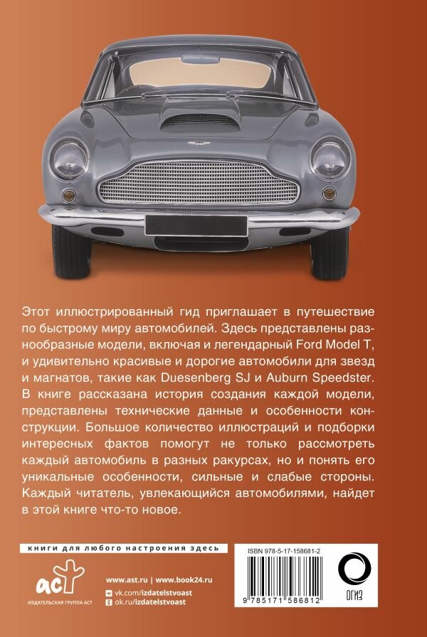 Этот иллюстрированный гид приглашает в путешествие по быстрому миру автомобилей. Здесь представлены разнообразные модели, включая и легендарный Ford Model T, и удивительно красивые и дорогие автомобили для звезд и магнатов, такие как Duesenberg SJ и Auburn Speedster.