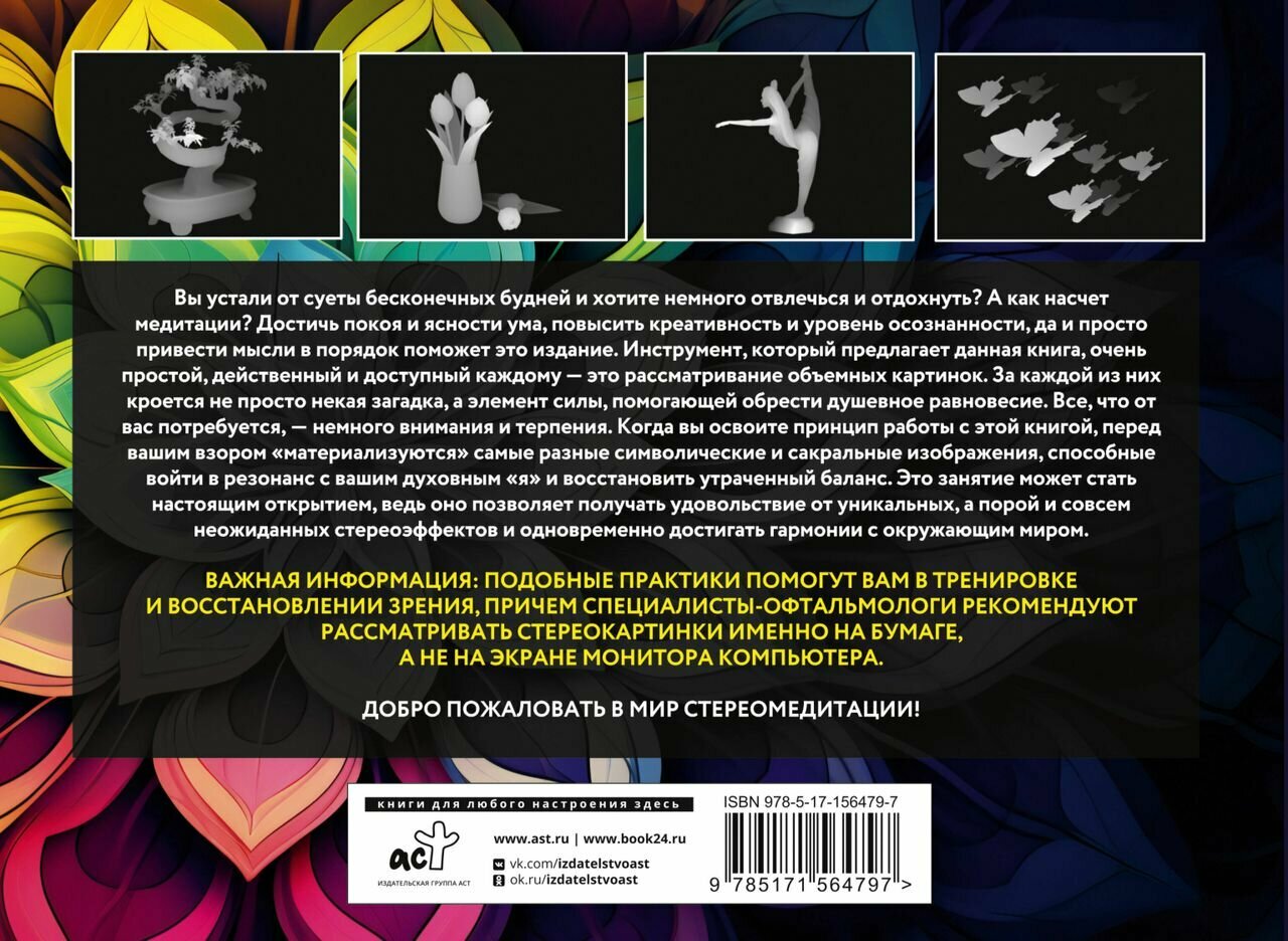 Это издание будет интересно тем, кого интересуют медитативные практики, кто хочет достичь покоя и ясности ума, повысить креативность и уровень осознанности. Сделать это предлагается не совсем обычным способом — с помощью рассматривания объемных картинок-загадок. Когда вы освоите принцип работы с данной книгой, перед вашим взором "материализуются" самые разные сакральные изображения и символы, удивительным образом воздействующие на подсознание и помогающие обрести гармонию как с самим собой, так и с окружающим миром. Это занятие может стать настоящим открытием, оно позволит получить удовольствие и пользу от уникальных, а порой и совсем неожиданных стереоэффектов.Добро пожаловать в мир стереомедитации!