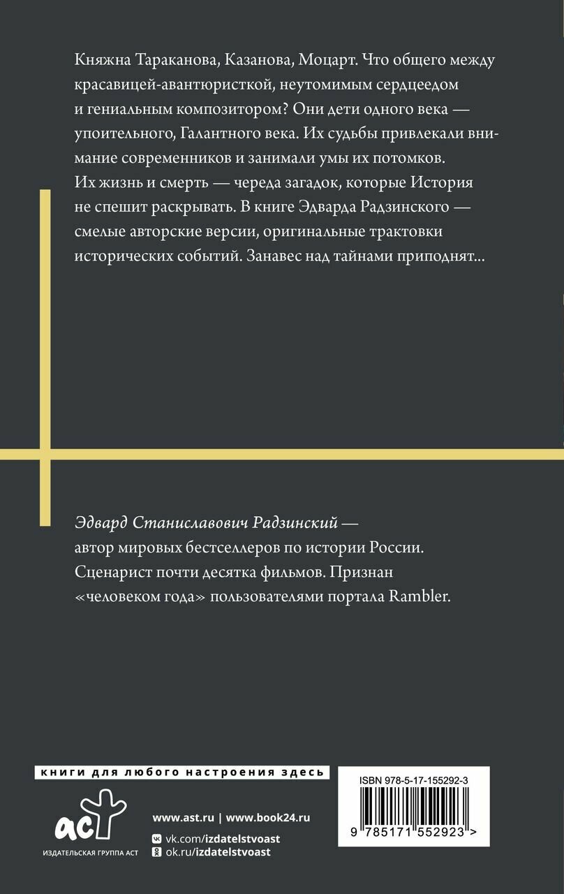 Княжна Тараканова, Казанова, Моцарт. Что общего между красавицей-авантюристкой, неутомимым сердцеедом и гениальным композитором? Они дети одного века - упоительного, Галантного века. Их судьбы привлекали внимание современников и занимали умы их потомков. Их жизнь и смерть - череда загадок, которые История не спешит раскрывать. В книге Эдварда Радзинского - смелые авторские версии, оригинальные трактовки исторических событий. Занавес над тайнами приподнят...