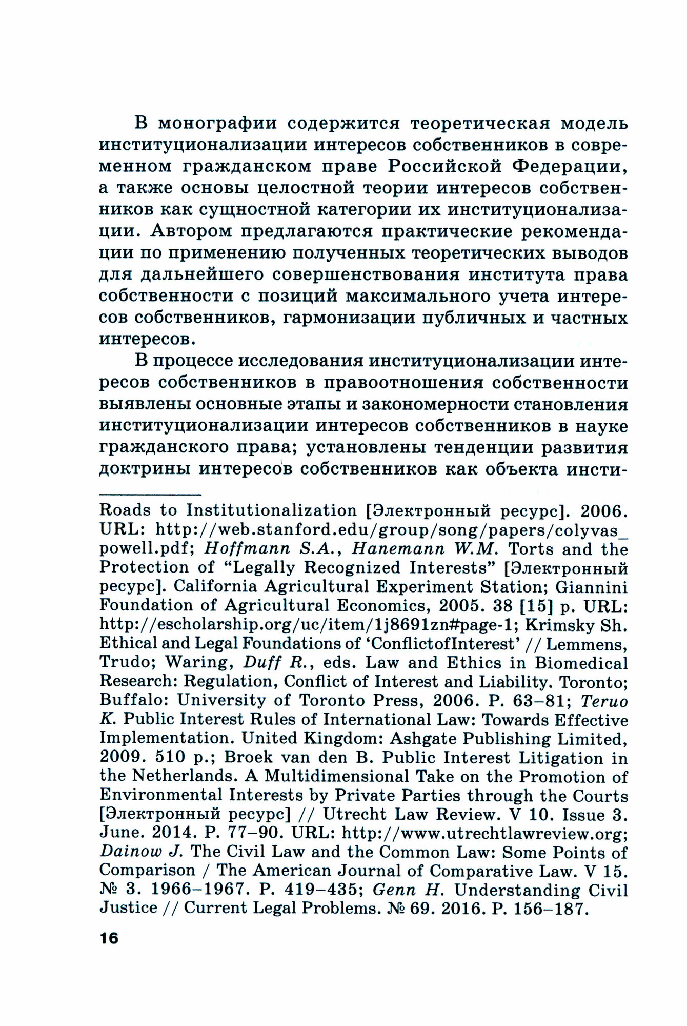 В монографии содержится теоретико-прикладной анализ институционализации интересов собственников в современном гражданском праве, а также основы целостной теории интересов собственников как сущностной категории их институционализации. Автором предлагаются практические рекомендации по применению полученных теоретических выводов для дальнейшего совершенствования института права собственности с позиций максимального учета интересов собственников, гармонизации публичных и частных интересов.