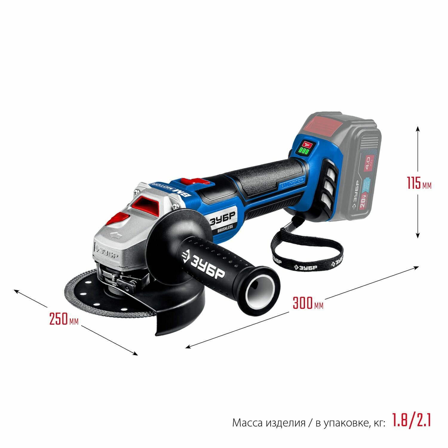 Угловая шлифмашина ЗУБР , предназначена для зачистки, шлифовки и резки металлов, обработки бетона и камня при установке соответствующих шлифовальных, отрезных, алмазных кругов. Бесщеточный двигатель Brushless обладает целым рядом преимуществ по сравнению с обычным щеточным двигателем: высокий крутящий момент (в 2 раза выше, чем у аналогичного щеточного двигателя), высокий КПД благодаря максимально эффективному преобразованию электромагнитной энергии в механическую (ввиду отсутствия перекоммутаций), низкое энергопотребление, вследствие чего изделие работает до 4 раз дольше на одном заряде батареи, высокая степень защиты двигателя благодаря интеллектуальному управлению, контроллер двигателя позволяет гибко регулировать крутящий момент и поддерживать его на максимальном уровне в широком диапазоне оборотов, отсутствие нагрева и потерь из-за переходных сопротивлений, повышенная надежность ввиду отсутствия искрения, трения и контактирующих деталей.