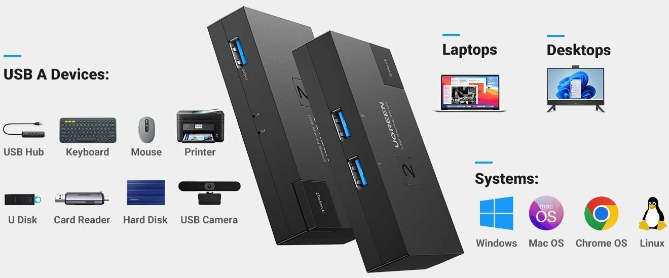 Широкая совместимость и технология Plug and Play: коммутатор UGREEN USB 3.0 широко совместим с 10/8/8.1/7/Vista/XP, Mac OS, Linux и Chrome OS. Подключи и работай, установка драйверов не требуется.