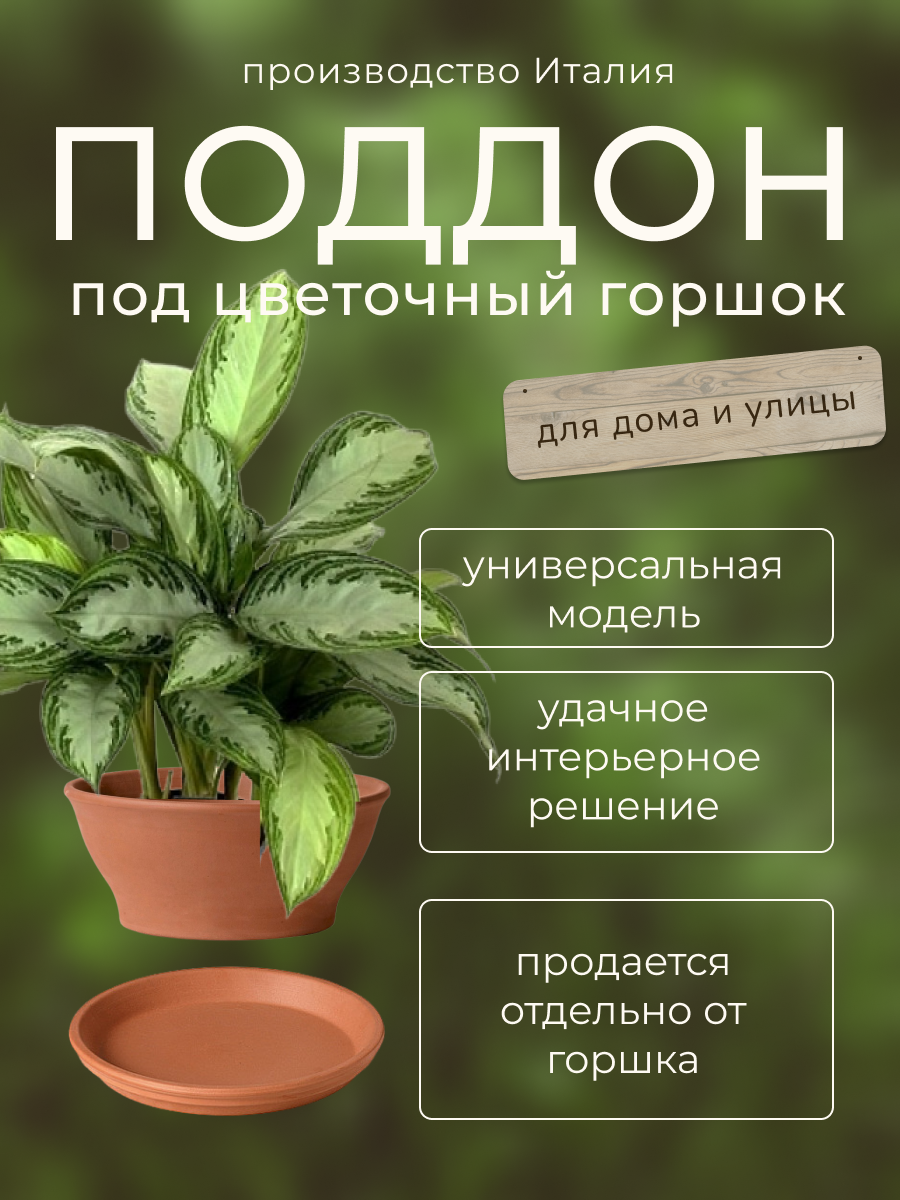 Поддон для горшка — подставка из керамики против вытекания воды из цветочного горшка. Керамический материал прочный и долговечный, обладает морозостойкостью, имеет повышенную устойчивость к ультрафиолетовому излучению. Может использоваться вне помещений. Натуральный терракотовый цвет поддона гармонично сочетается с живой зеленью.