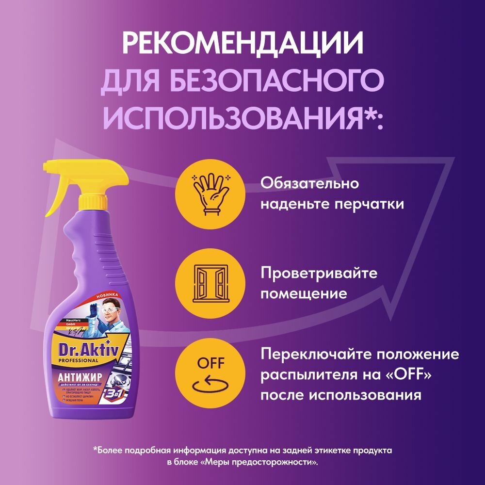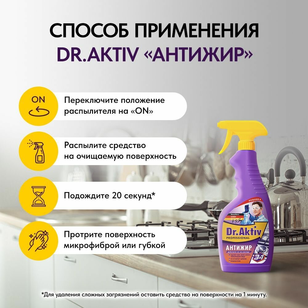 Эксперт профессионального клининга Dr.Aktiv предлагает вам средство для домашнего использования с профессиональной формулой: Спрей Dr.Aktiv Антижир. Активная формула быстро и эффективно расщепляет жир, нагар и копоть, оставаясь безопасной для большинства видов поверхностей. Сбалансированное сочетание компонентов усиливает воздействие щелочной основы. Средство имеет оптимальный уровень рН 12-12,5. Подходит для уборки на кухне и предназначено для очищения газовых плит, духовых шкафов, микроволновых печей, сковородок, казанов, кухонного фартука, кафеля, вытяжки. Не рекомендуется применять для хромированных, окрашенных, алюминиевых, пластиковых, резиновых, стеклокерамических поверхностей.