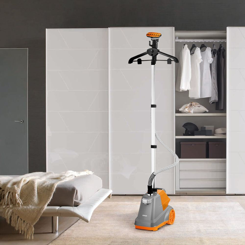 Вертикальный отпариватель Kitfort КТ-9157 позволяет быстро прогладить любые вещи и изделия из текстиля. Кроме глажки и отпаривания он обрабатывает вещи мощной струёй горячего пара, проводя таким образом чистку и дезинфекцию. Во время отпаривания одежда может висеть на вешалке отпаривателя, установленной на телескопической стойке (которую при необходимости можно сложить), на обычной вешалке, подвешенной к отпаривателю, просто на вешалке, на сушилке для белья. Вешалка и телескопическая стойка складные, паровой шланг съёмный, а корпус-компактный. Такая конструкция позволяет удобно хранить его в комнате или в шкафу. Корпус прибора оснащён колёсиками для удобного перемещения по квартире. При необходимости можно установить ворсовую насадку-зажим. Ворсовая щётка справится с очисткой ткани, мягкой мебели от шерсти, волос и ворса. Зажим можно использовать для отпаривания брюк.