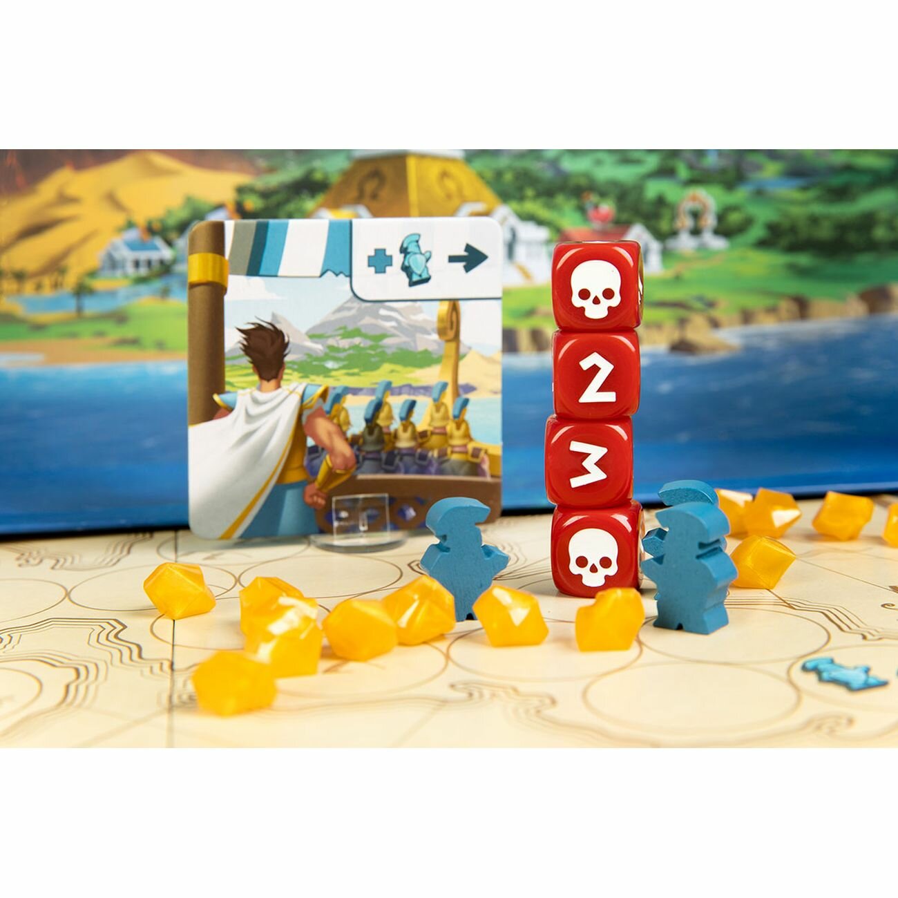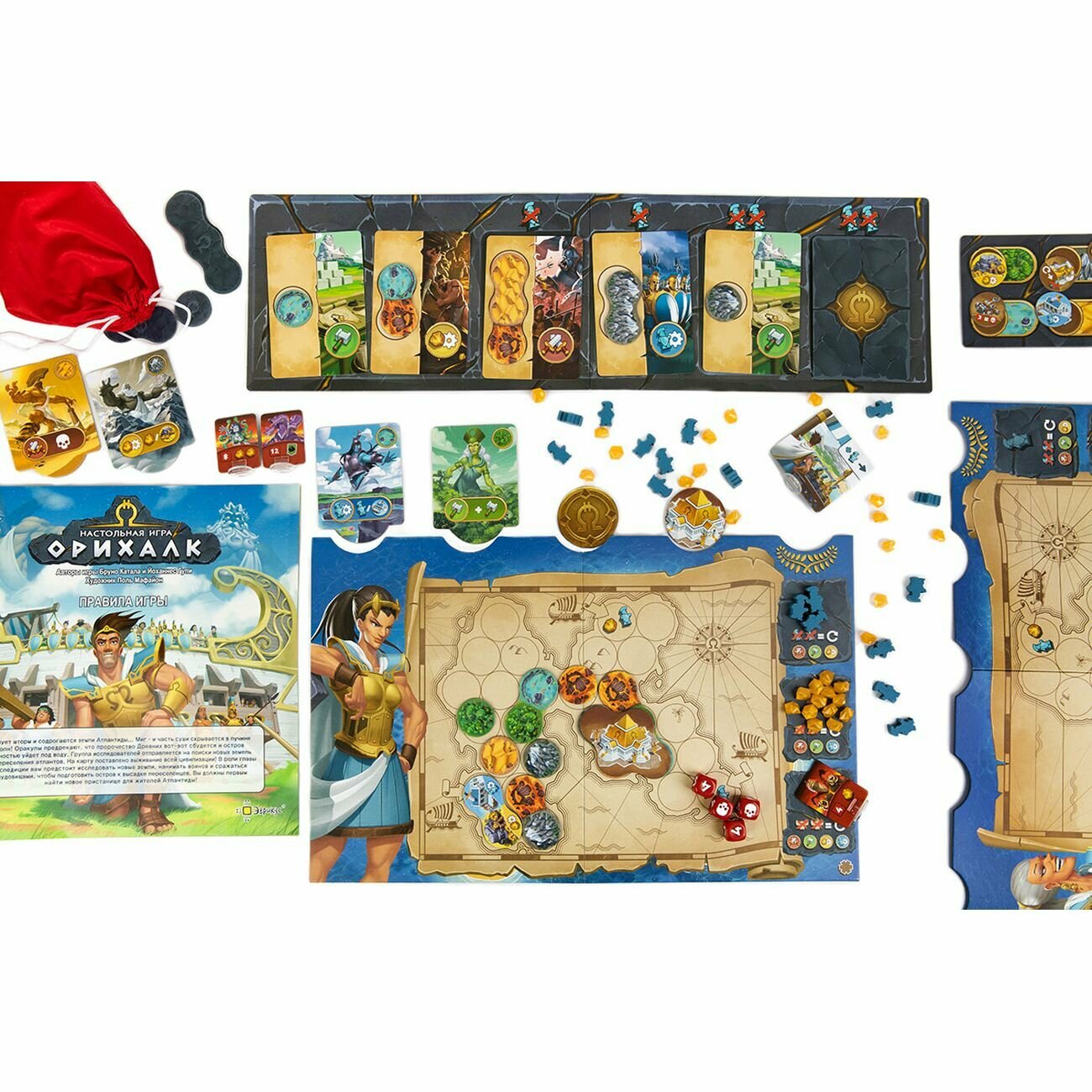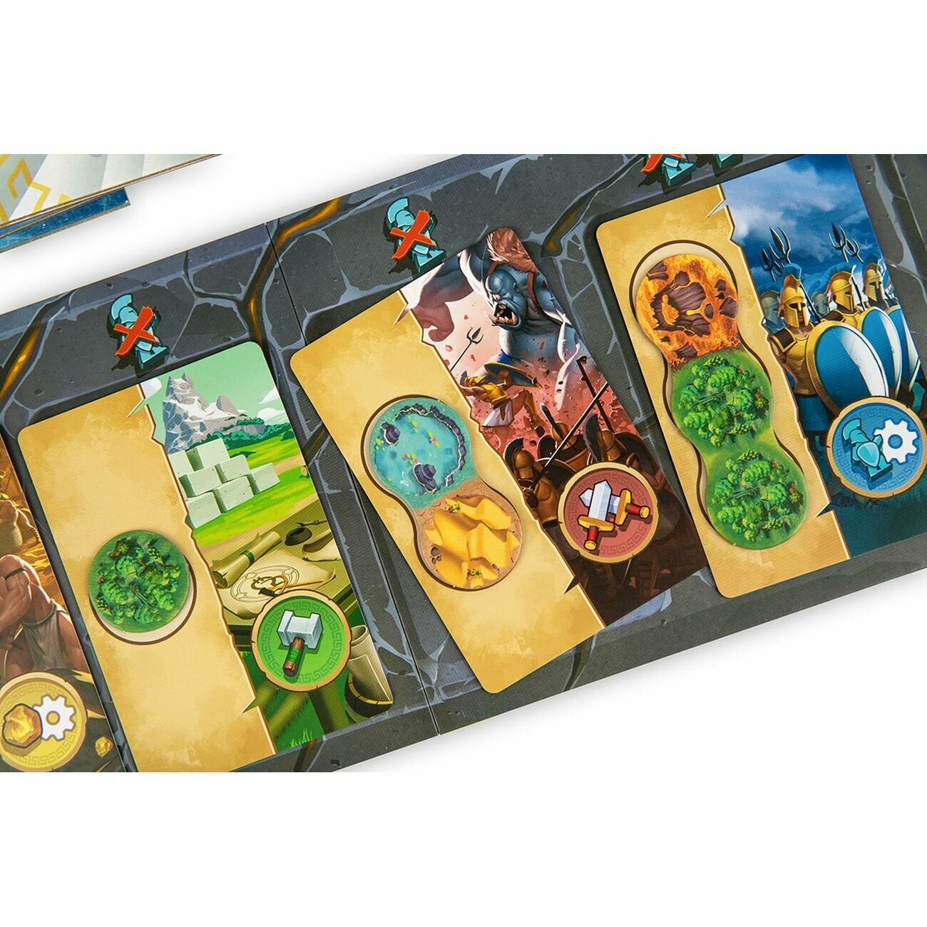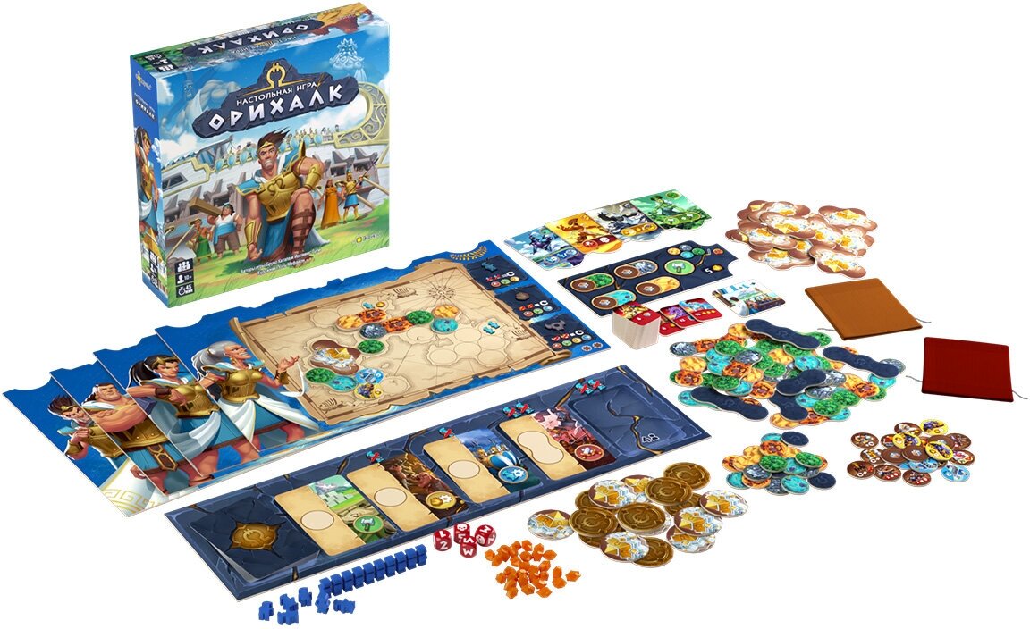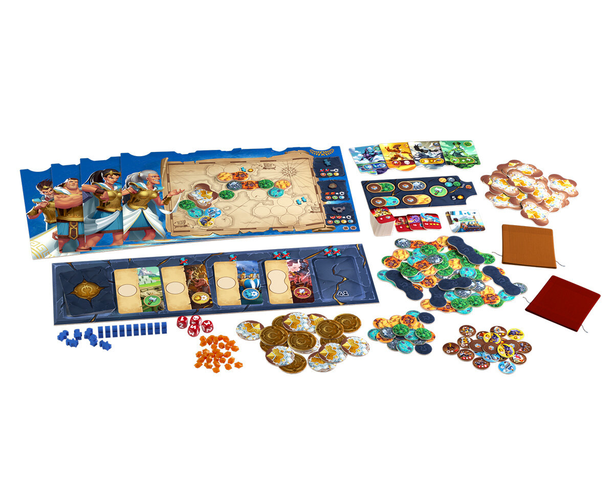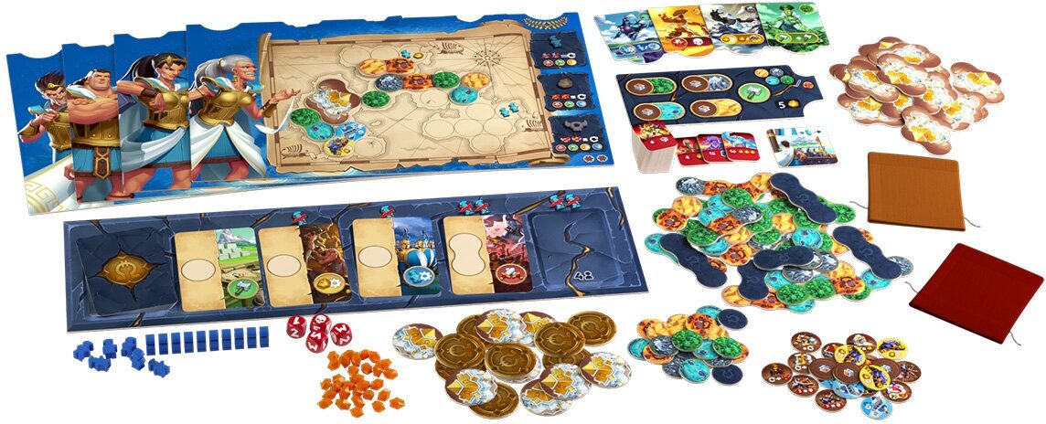 | Комплектация | 65 тайлов местности, 30 гоплитов, 30 слитков орихалка, 20 жетонов мифических существ, 26 жетонов зданий, 17 двусторонних победных жетонов, 17 тайлов храмов, 12 карт действий, 4 двусторонних планшета острова, 4 двусторонних тайла титанов, 4 тайла метрополии, 4 кубика сражений, 2 мешка для мифических существ и зданий, Планшет строительства, Планшет действий, Жетон первого игрока, Правила игры |