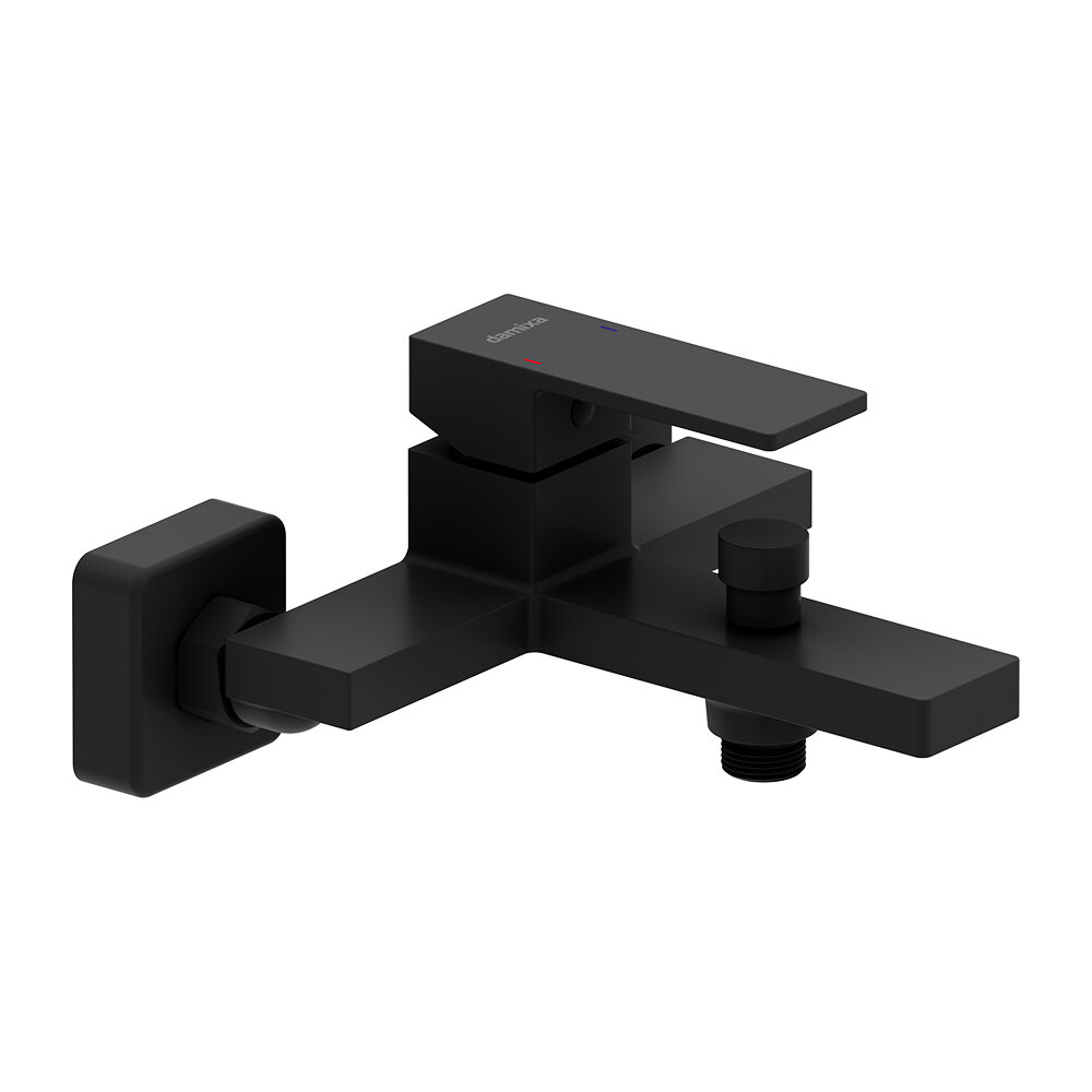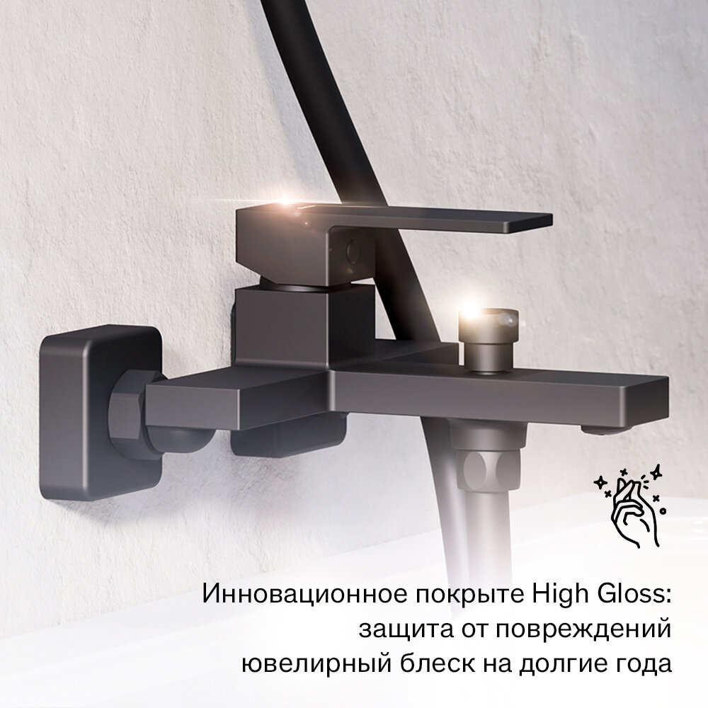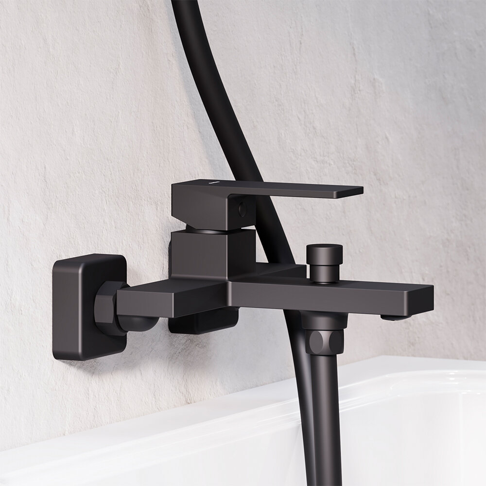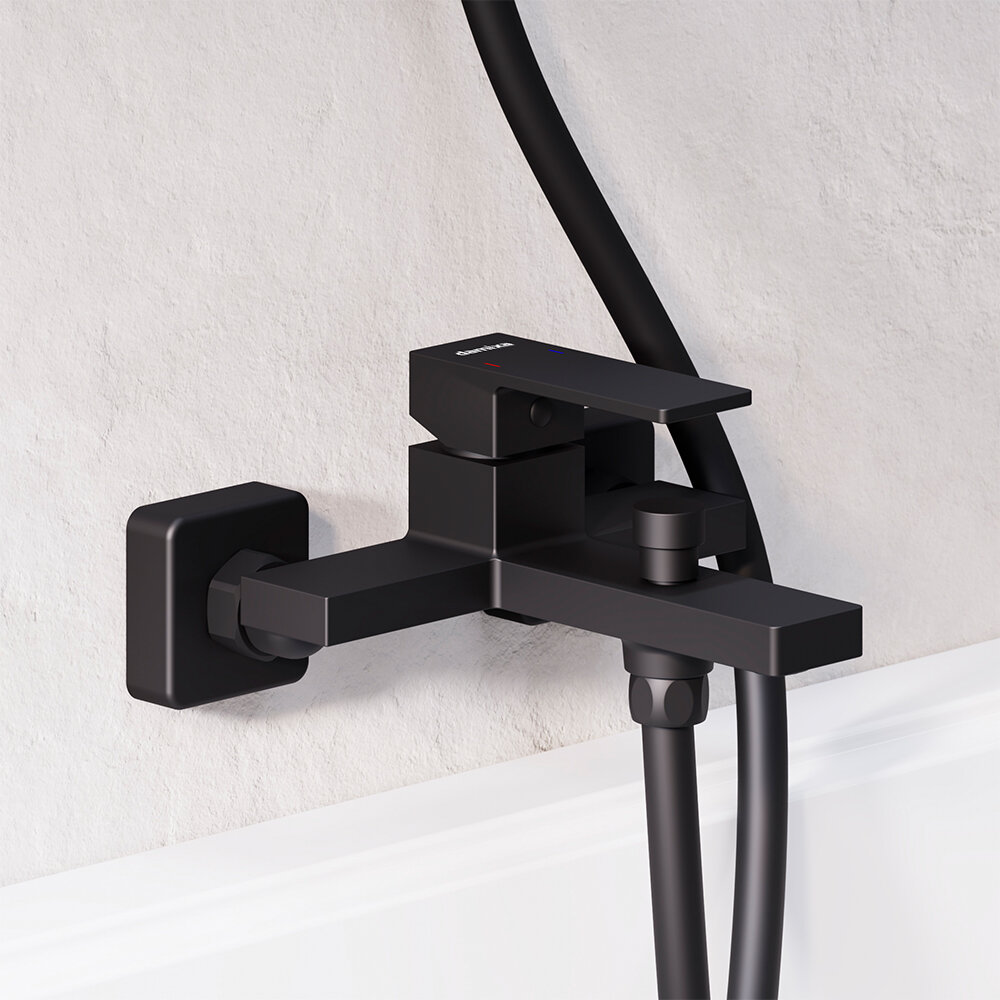 Корпус смесителя 1 шт.; эксцентрические переходники 2 шт.; декоративные розетки 2 шт.; инструкция изделия. Черный матовый, смеситель для ванны и душа, строгие прямоугольные формы, вакуумный дивертер