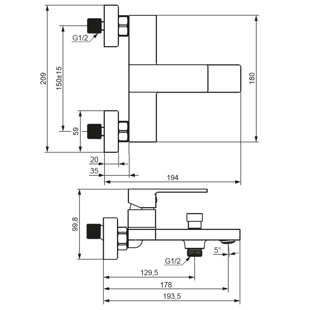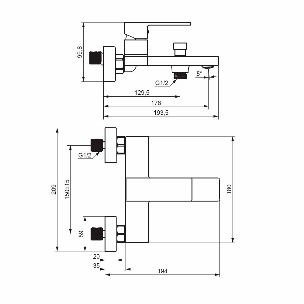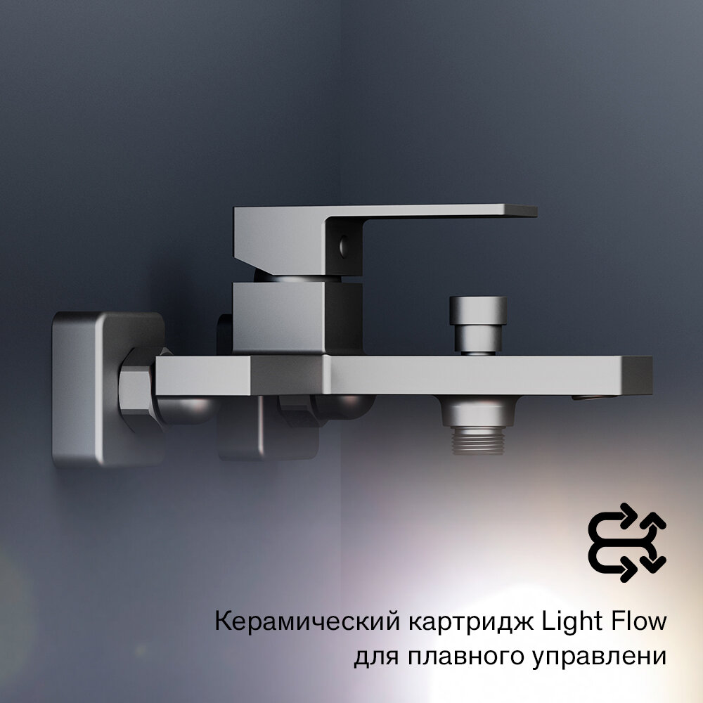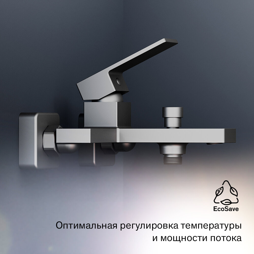 Корпус смесителя 1 шт.; эксцентрические переходники 2 шт.; декоративные розетки 2 шт.; инструкция изделия. Черный матовый, смеситель для ванны и душа, строгие прямоугольные формы, вакуумный дивертер