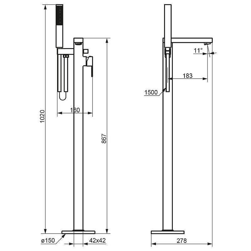 Корпус смесителя 1 шт.; излив 1 шт. ; кронштейн крепления 1 шт. ; комплект крепежный 1 шт. ; рчной душ 1 шт. ; шланг 1 шт. ; гибкая подводка 2 шт. ; декоративная тарелка 1 шт. ; инструкция . Хромированный, высокий отдельностоящий смеситель для отдельностоящей ванны и ручного душа, оригинальный дизайн строгие прямоугольные формы, ручной душ прямоугольной формы, управление одной ручкой