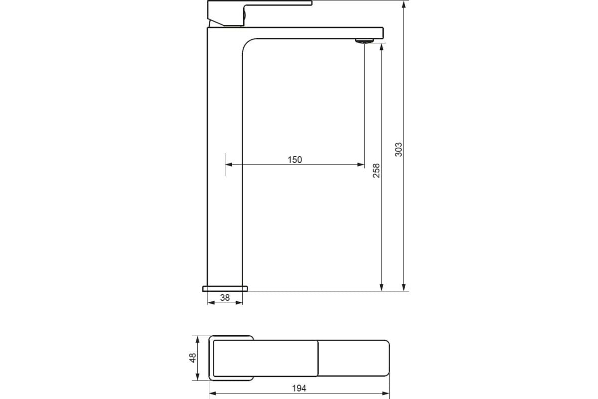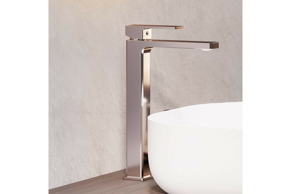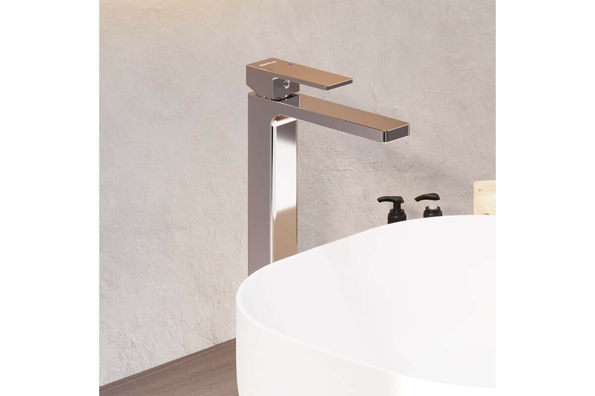 Корпус смесителя 1 шт.; подводка для воды 2 шт.; комплект крепления 1 компл.; инструкция изделия. Хромированный, высокий умывальник для накладной раковины, строгие прямоугольные формы