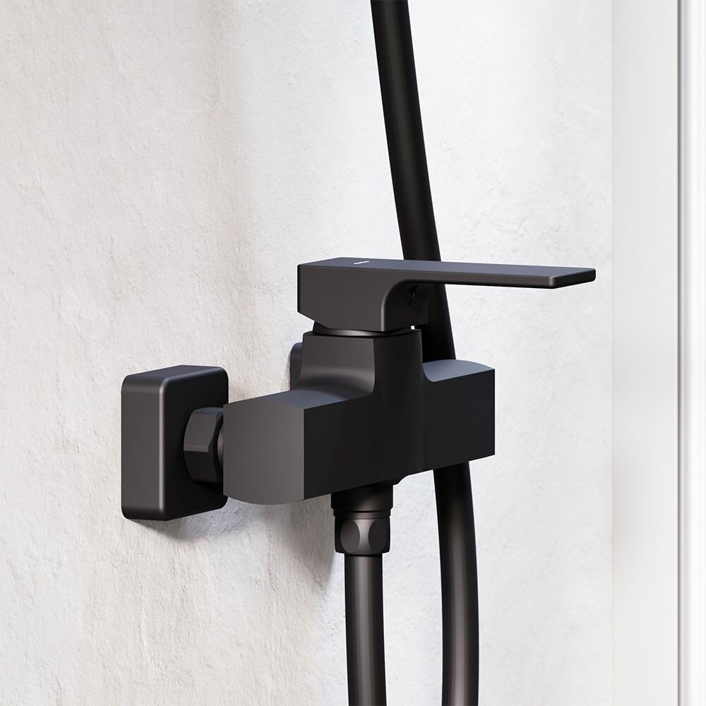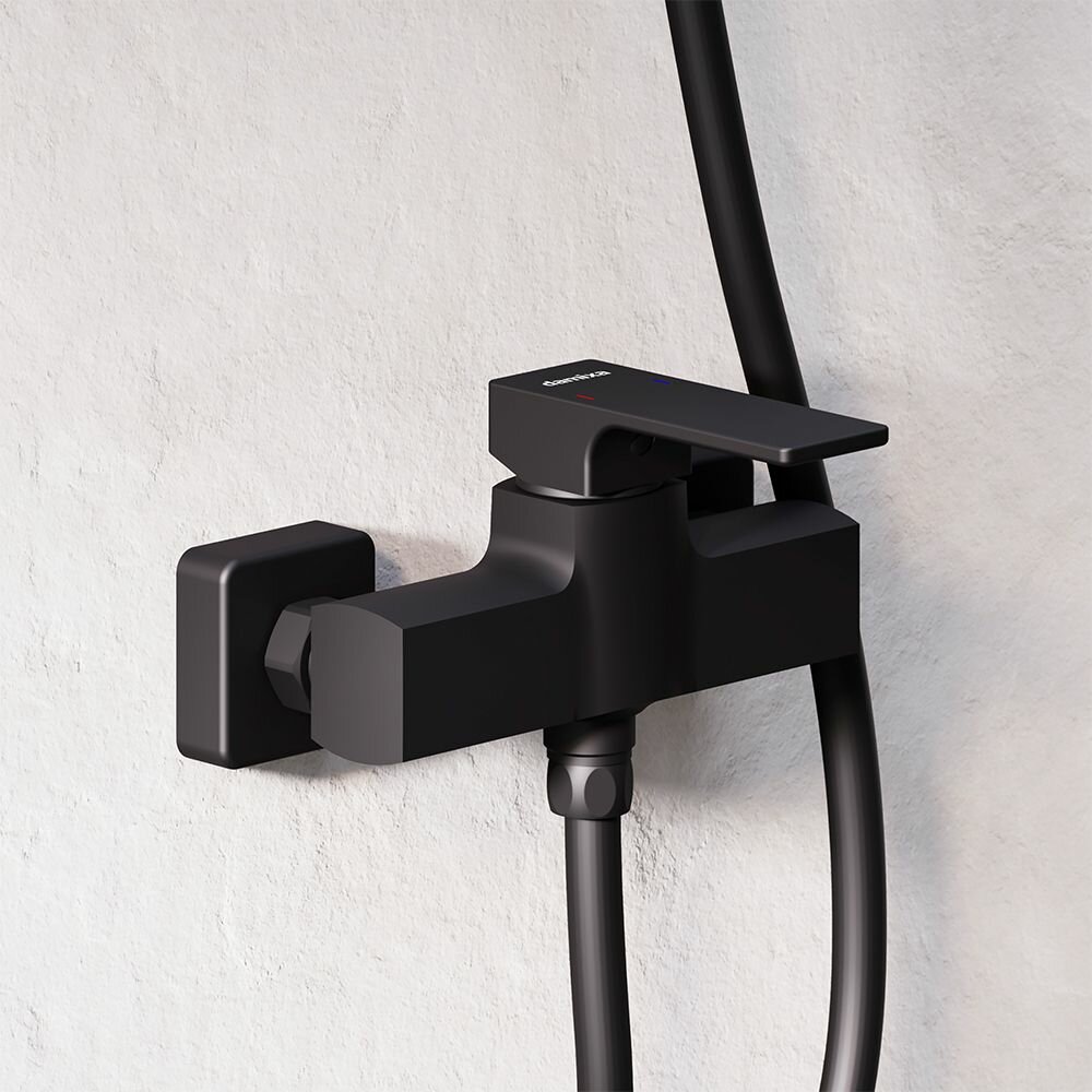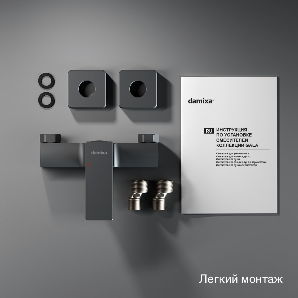 Корпус смесителя 1 шт.; эксцентрические переходники 2 шт.; декоративные розетки 2 шт.; инструкция изделия. Черный матовый смеситель для душа, керамический картридж