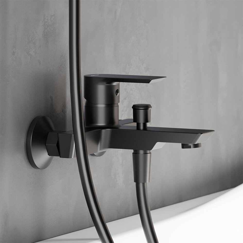Корпус смесителя 1 шт.; эксцентрические переходники 2 шт.; декоративные розетки 2 шт.; инструкция изделия. Черный, смеситель для ванны и душа, однорычажный, латунь, керамический картридж, ручка и излив имеют плоскую форму