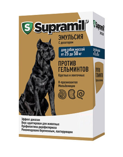 Supramil эмульсия – первая в мире антигельминтная эмульсия широкого спектра действия для собак массой от 25 до 50 кг, предназначенная для лечения и профилактики заражения круглыми и ленточными гельминтами, а также дирофиляриоза. Преимущества препарата уникальная точность дозирования эмульсии в отличие от таблеток; однородная стабильная структура эмульсии не требует предварительного встряхивания, готова к применению в любой момент; “Золотой стандарт” лечения гельминтозов: действующими веществами являются R-празиквантел и мильбецина оксим. Это определяет эффективность препарата против всех видов гельминтов на уровне известных импортных антигельминтиков; r-празиквантел: уникальная запатентованная НВП «Астрафарм» субстанция. Благодаря R-празиквантелу повышена безопасность (в результате снижения в 2 раза относительно минимальной дозировки обычного празиквантела), улучшена поедаемость (благодаря снижению горького вкуса); безопасность для собак и щенков, беременных и кормящих животных, что подтверждено исследованиями; удобство дачи обеспечено наличием специального безопасного шприца-дозатора; достаточно одного применения благодаря составу, точности дозирования и форме выпуска.