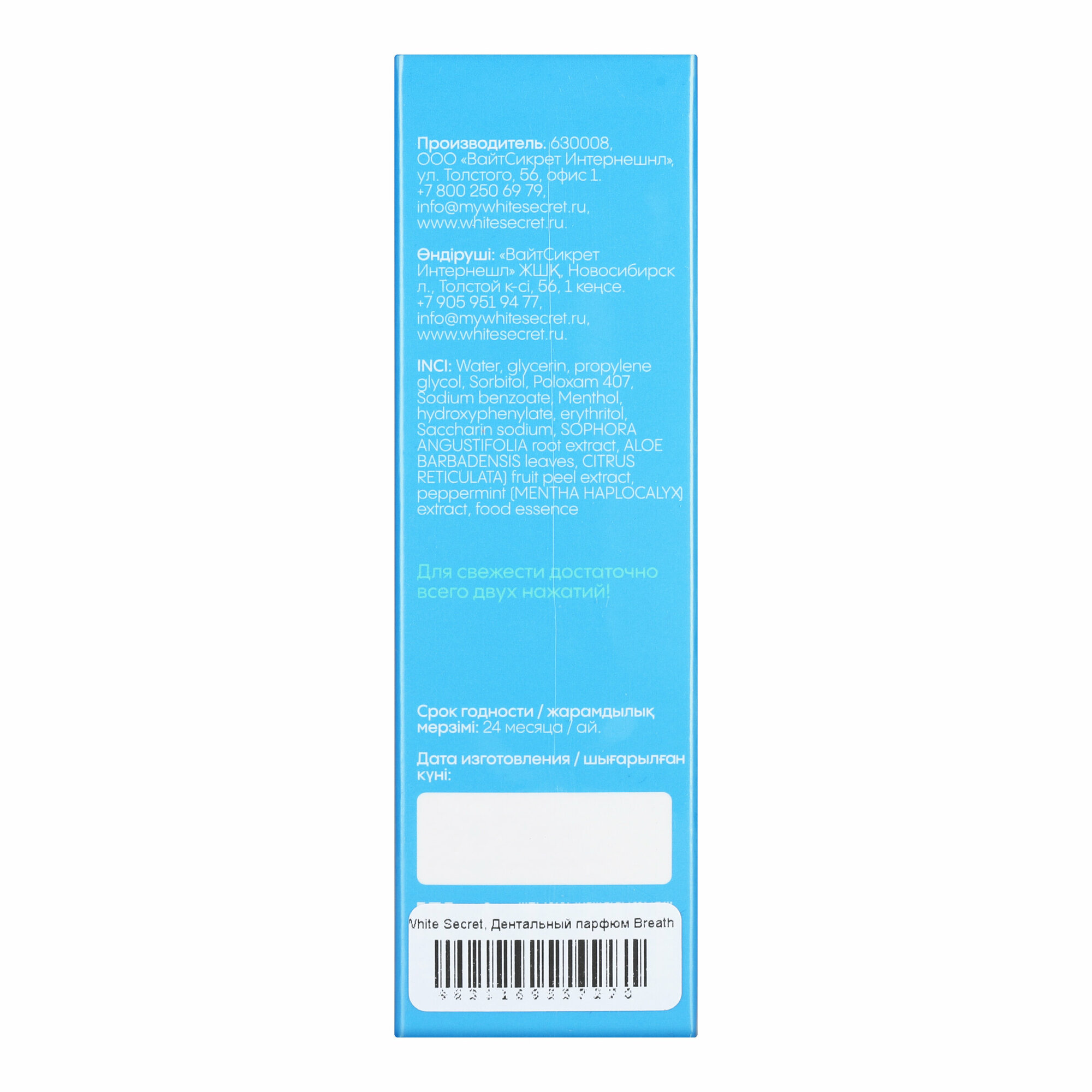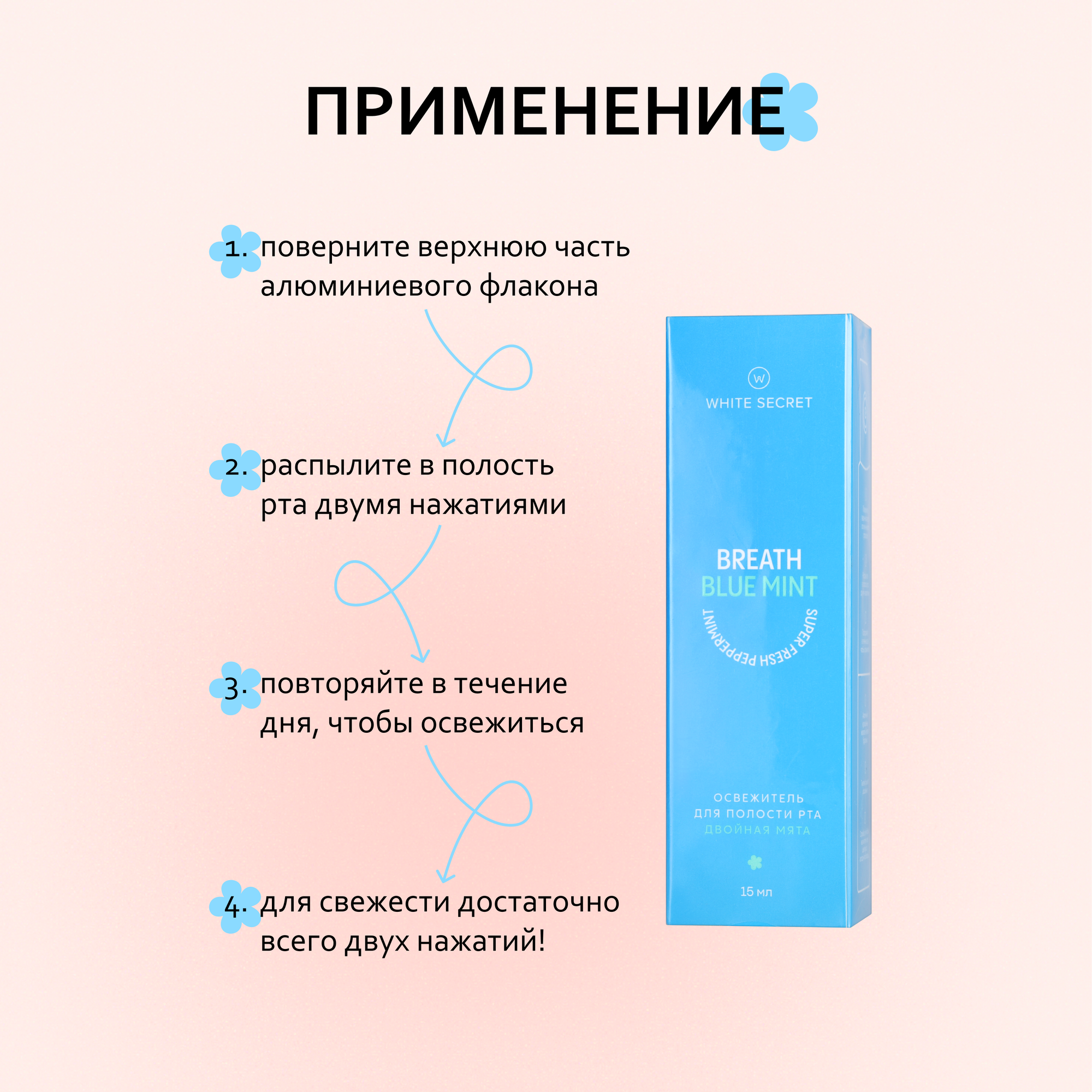 Освежитель White Secret Blue Mint способствует уменьшению количества бактерий в полости рта, сохраняя дыхание свежим на протяжении всего дня. Со вкусом перечной мяты. Экстракт Софоры Японской обладает мощным бактерицидным свойством. Экстракт листьев алоэ — природный антисептик, который уменьшает кровоточивость и отек десен. Масло мандарина улучшает микроциркуляцию крови и питание десен. Комплекс витаминов имеет антиоксидантное действие.