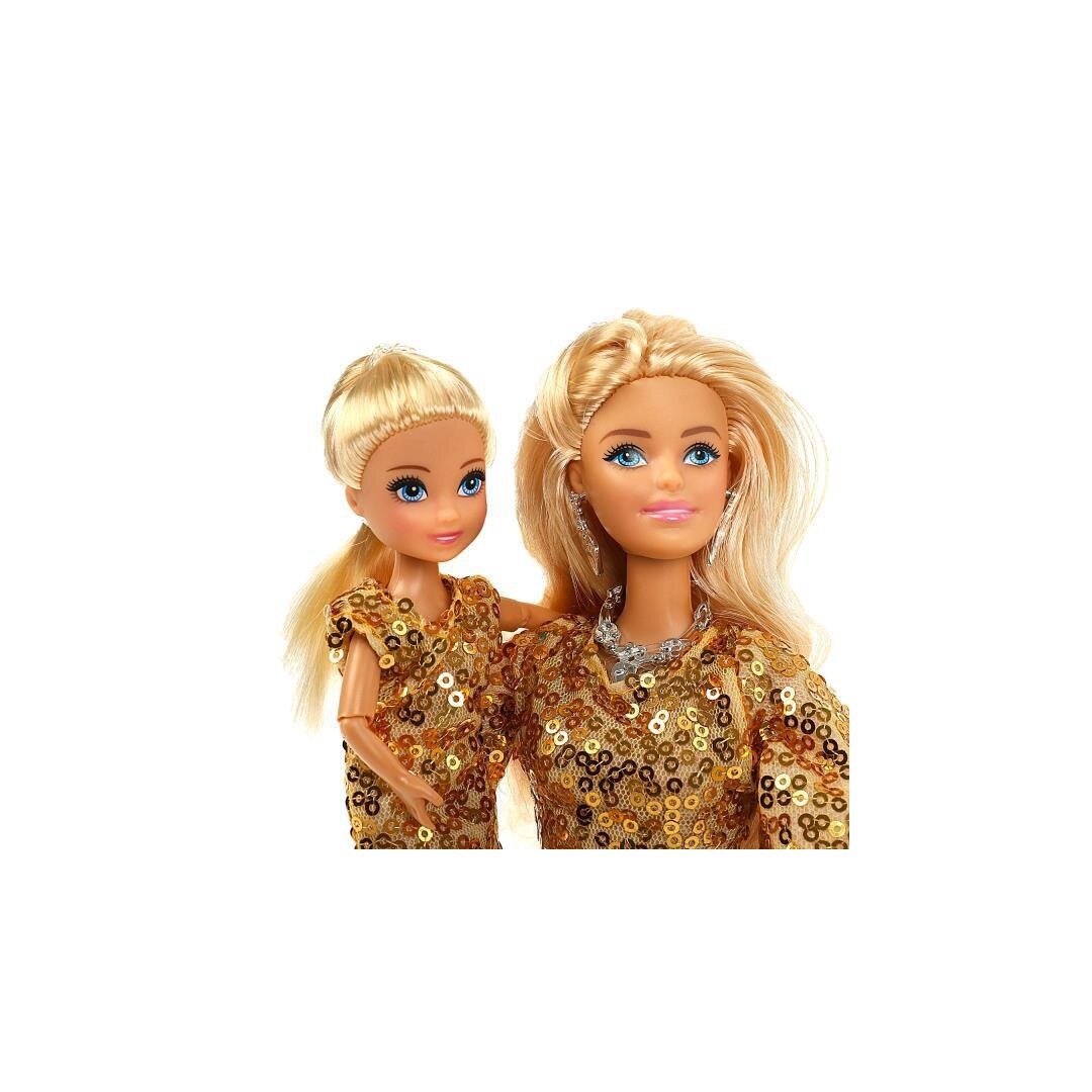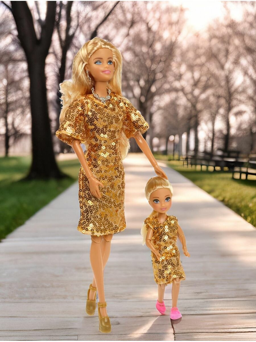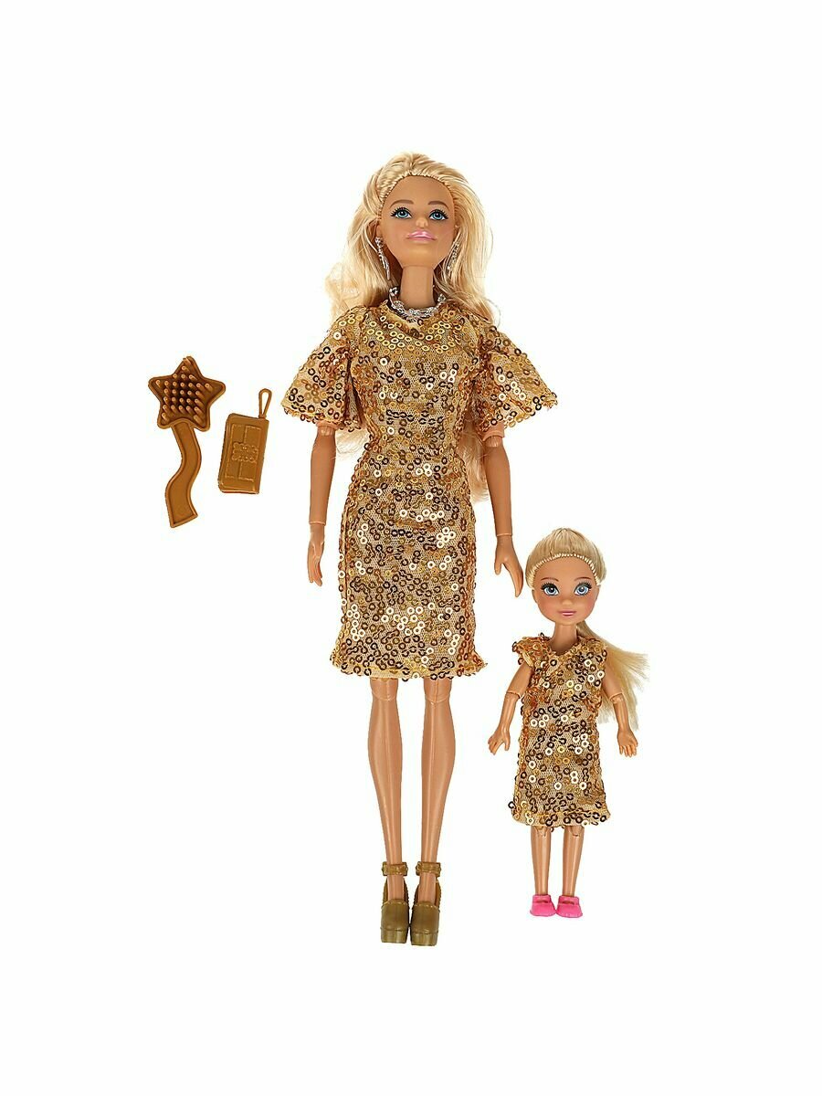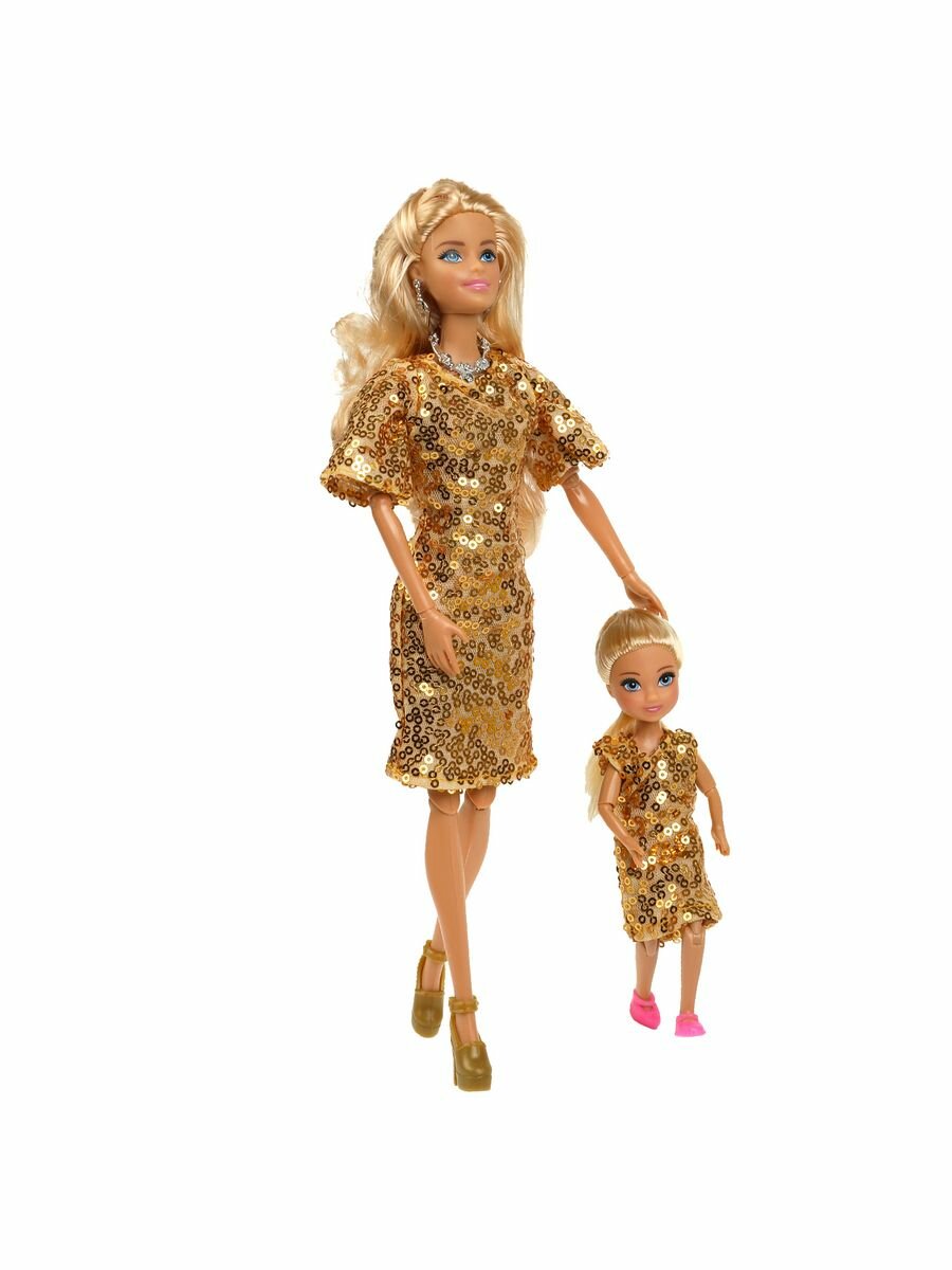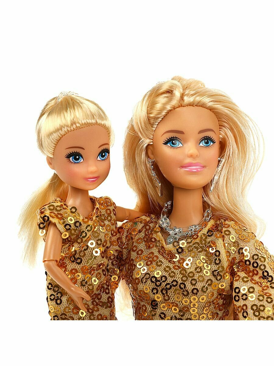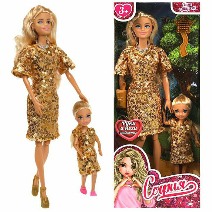 София и Анечка одеты в гармонирующие друг с другом платья золотистого цвета с пайетками. Образ Софии дополнен стильными украшениями: крупными серьгами и колье. Одежду можно легко снять и надеть. С такими модными куклами девочке будет интересно и весело играть: благодаря тому, что у них подвижные руки и ноги, им можно придать любое положение. У Софии и её малышки длинные красивые волосы, которые хозяйка кукол сможет заплетать в разные причёски. Детально проработанный дизайн игрушки вдохновит девочку на новые игровые сюжеты.