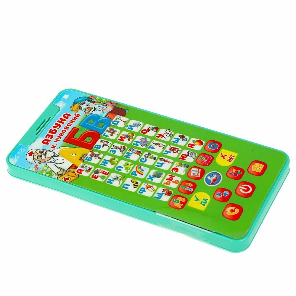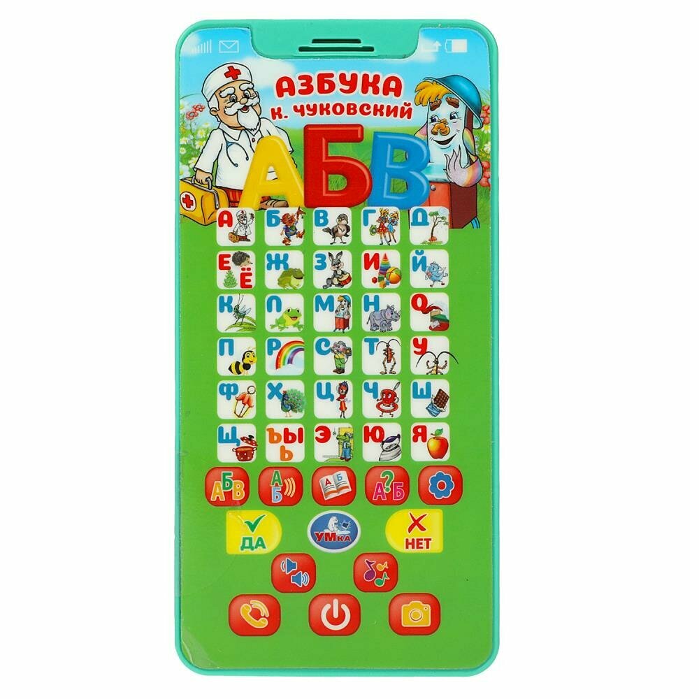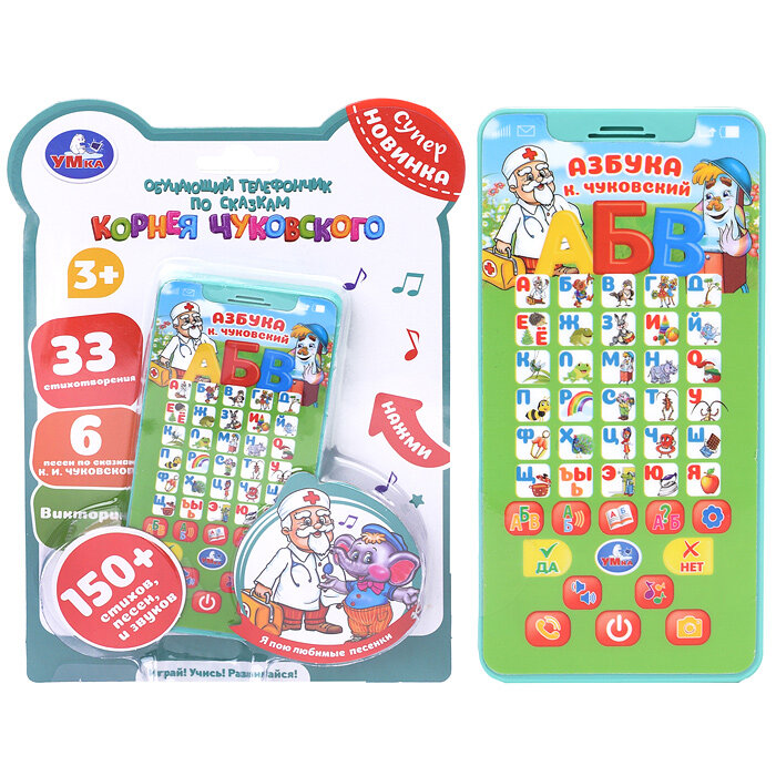 Умка Обучающий телефончик с песнями по сказкам К. И. Чуковского непременно понравится малышу: - 6 песен по сказкам К. И. Чуковского: «Айболит», «Муха-Цокотуха», «Мойдодыр», «Краденое солнце», «Тараканище», «Федорино горе» - 33 стихотворения - реалистичные звуки телефона и фотоаппарата - викторина - регулировка громкости Яркий телефон сделает обучение малыша лёгким и интересным. Он с удовольствием будет нажимать на разноцветные кнопочки и слушать весёлые песенки и звуки. В увлекательной игровой форме ребёнку будет легко выучить алфавит. Компактную игрушку удобно брать с собой. Обучающий телефон развивает: - память - слуховое восприятие и музыкальный слух - тактильные навыки - визуальное восприятие - логическое мышление - моторику Размер игрушки: 24 х 18 х 2 см Материал: пластмасса Работает от 3 - х батареек типа ААА Возраст: детям от 3 - х лет