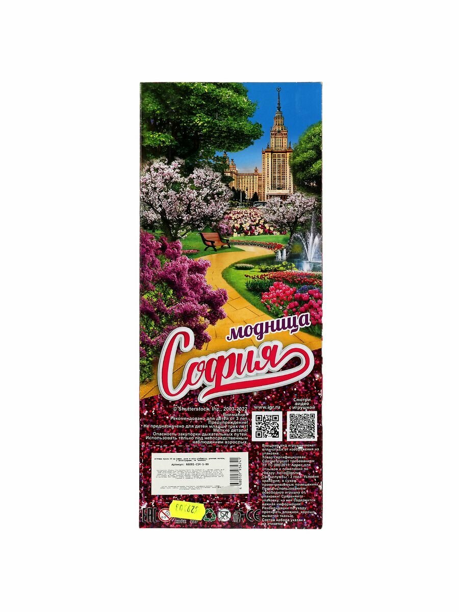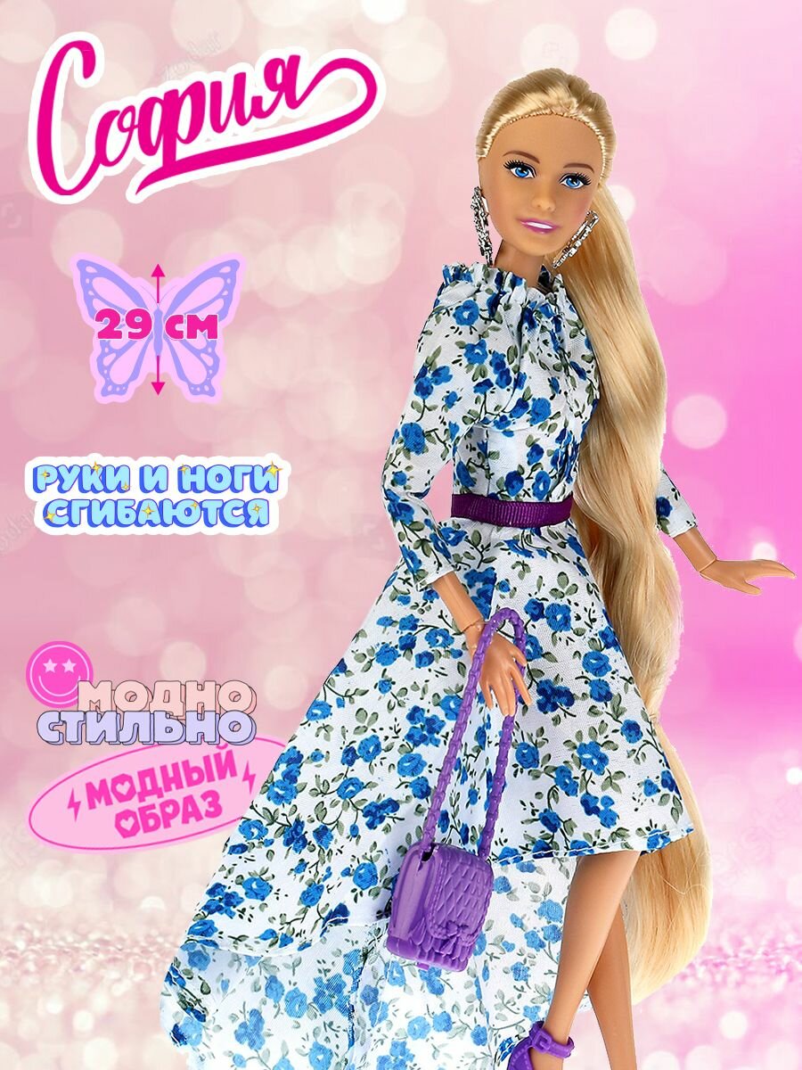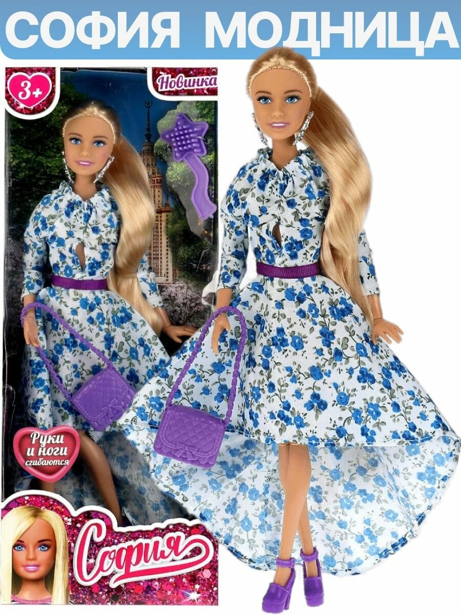 Модница София представлена в зимнем образе: она одета в тёплую разноцветную меховую шубку, розовую шапочку и стильные брюки, украшенные пайетками. Образ куколки дополняют стильные крупные серьги и элегантная сумочка. Одежду и аксессуары легко снять и надеть. С такой модной куклой девочке будет интересно и весело играть: благодаря тому, что руки и ноги куклы подвижны, им можно придать любое положение. У Софии длинные красивые волосы, которые хозяйка куклы сможет заплетать в разные причёски. Детально проработанный дизайн игрушки вдохновит девочку на новые игровые сюжеты.