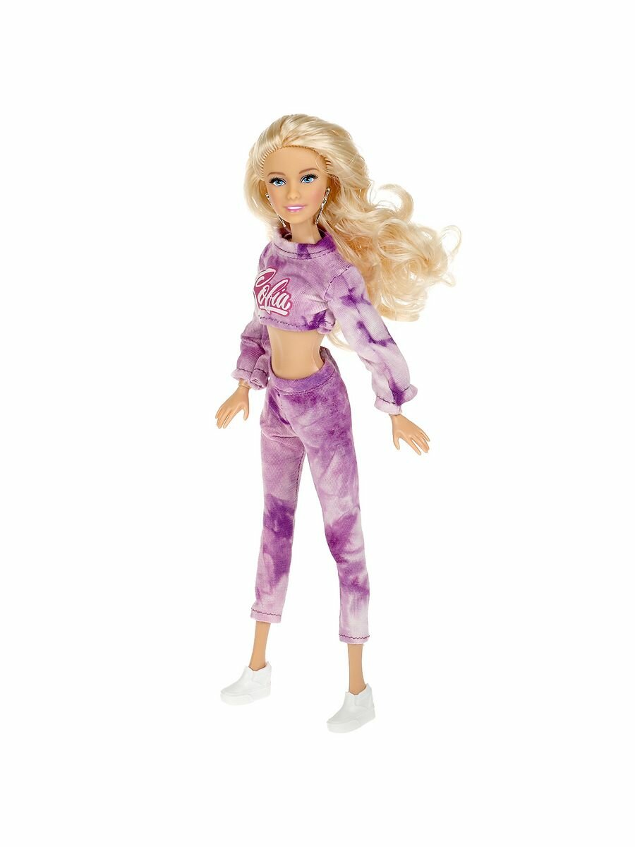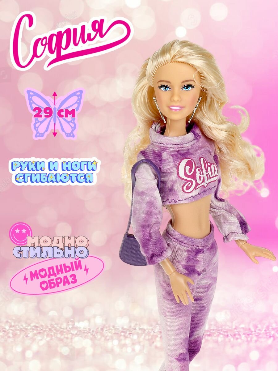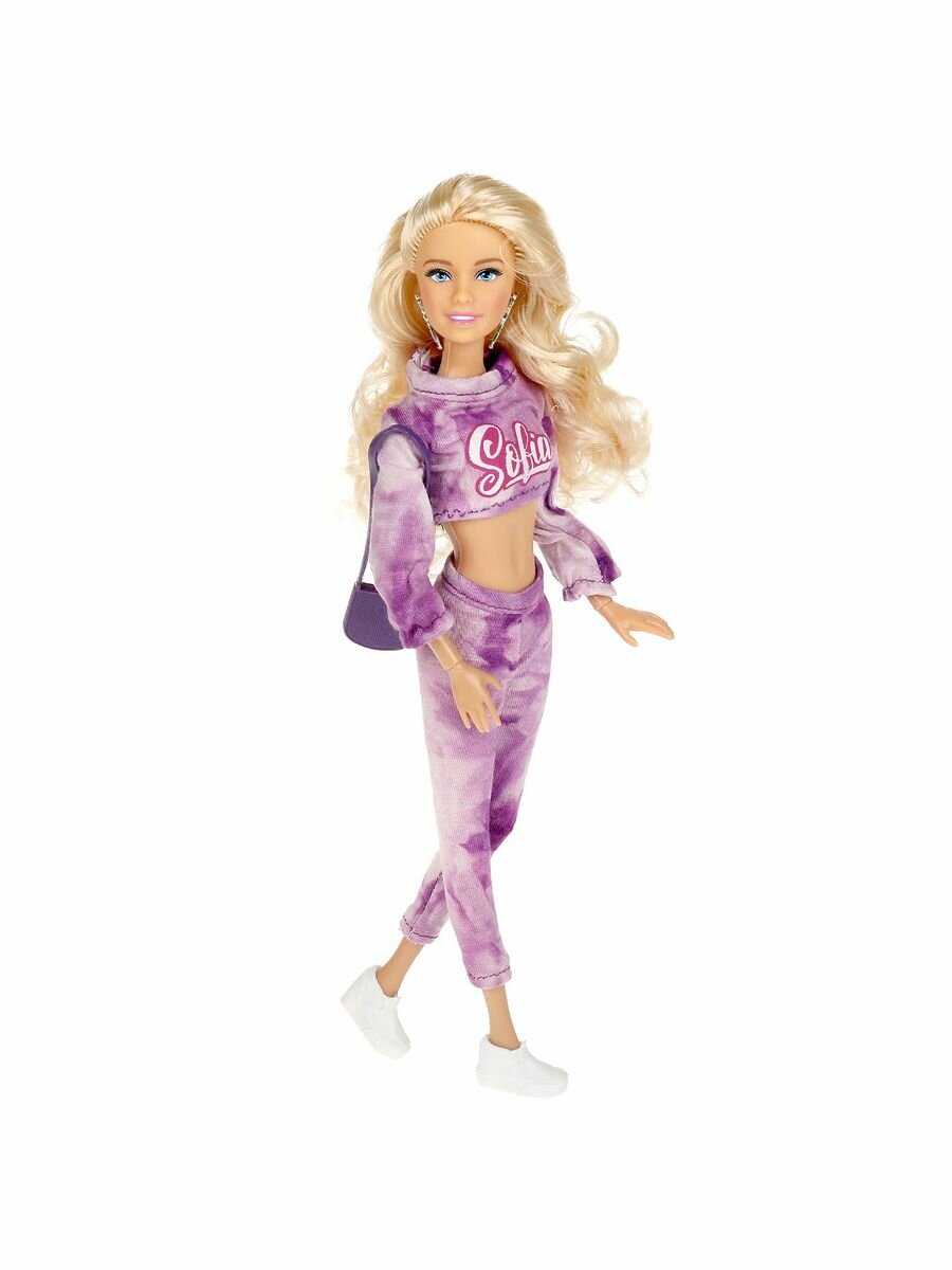 Модница - София одета в яркий спортивный костюм. Образ куколки дополняют модные крупные серьги и элегантная сумочка. Одежду и аксессуары легко снять и надеть. С такой модной куклой девочке будет интересно и весело играть: благодаря тому, что руки и ноги куклы подвижны, им можно придать любое положение. У Софии длинные красивые волосы, которые хозяйка куклы сможет заплетать в разные причёски. Детально проработанный дизайн игрушки вдохновит девочку на новые игровые сюжеты.