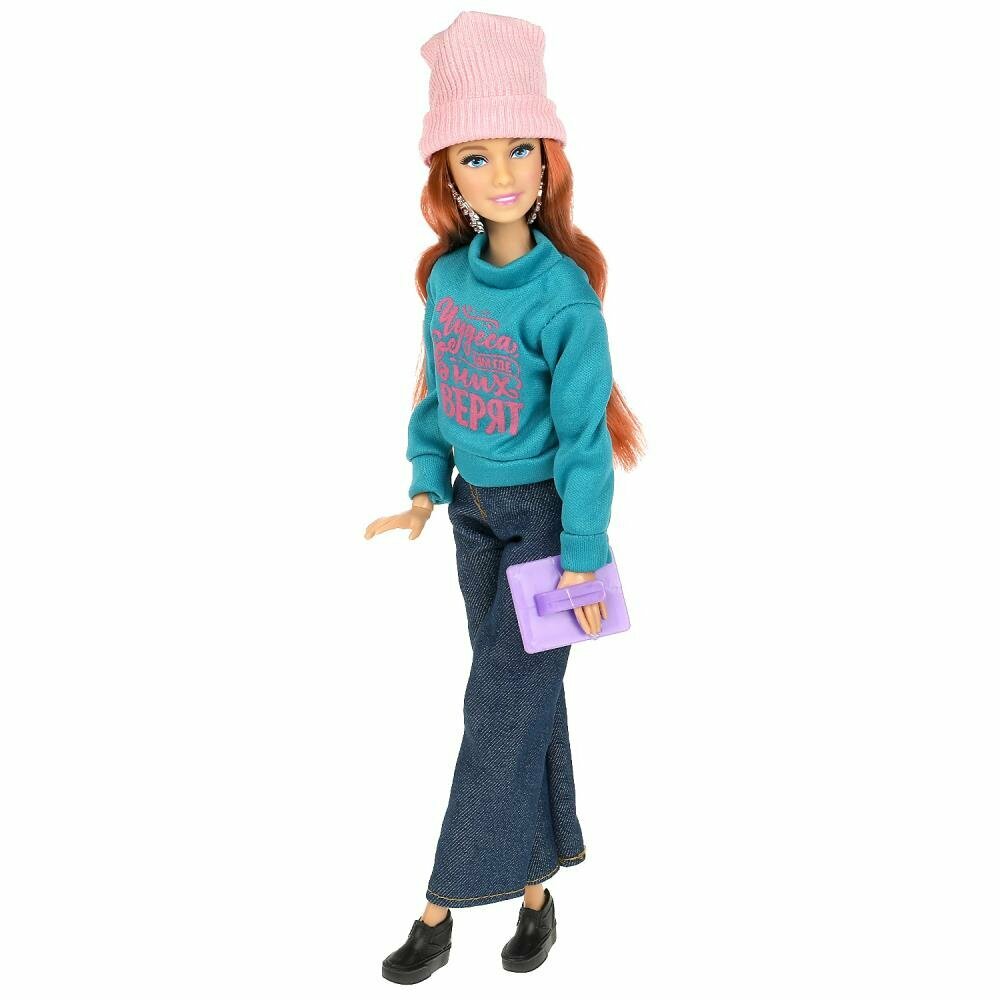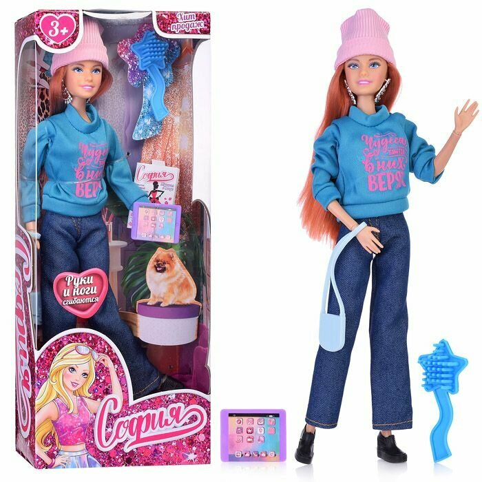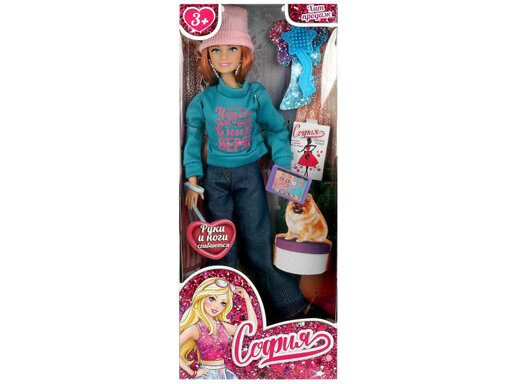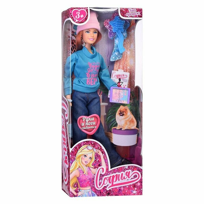 Модница - София одета в яркую голубую кофту с принтом и практичные джинсы. Образ куколки дополняют модные крупные серьги, розовая шапка и элегантная сумочка. Одежду и аксессуары легко снять и надеть. С такой модной куклой девочке будет интересно и весело играть: благодаря тому, что руки и ноги куклы подвижны, им можно придать любое положение. У Софии длинные красивые волосы, которые хозяйка куклы сможет заплетать в разные причёски. Детально проработанный дизайн игрушки вдохновит девочку на новые игровые сюжеты.