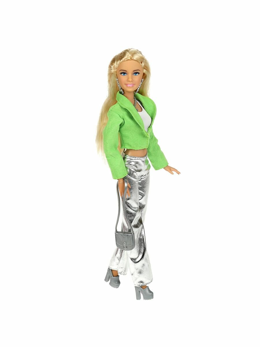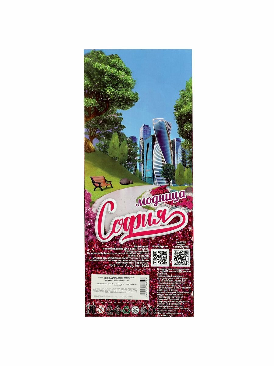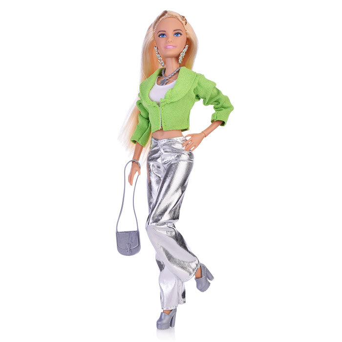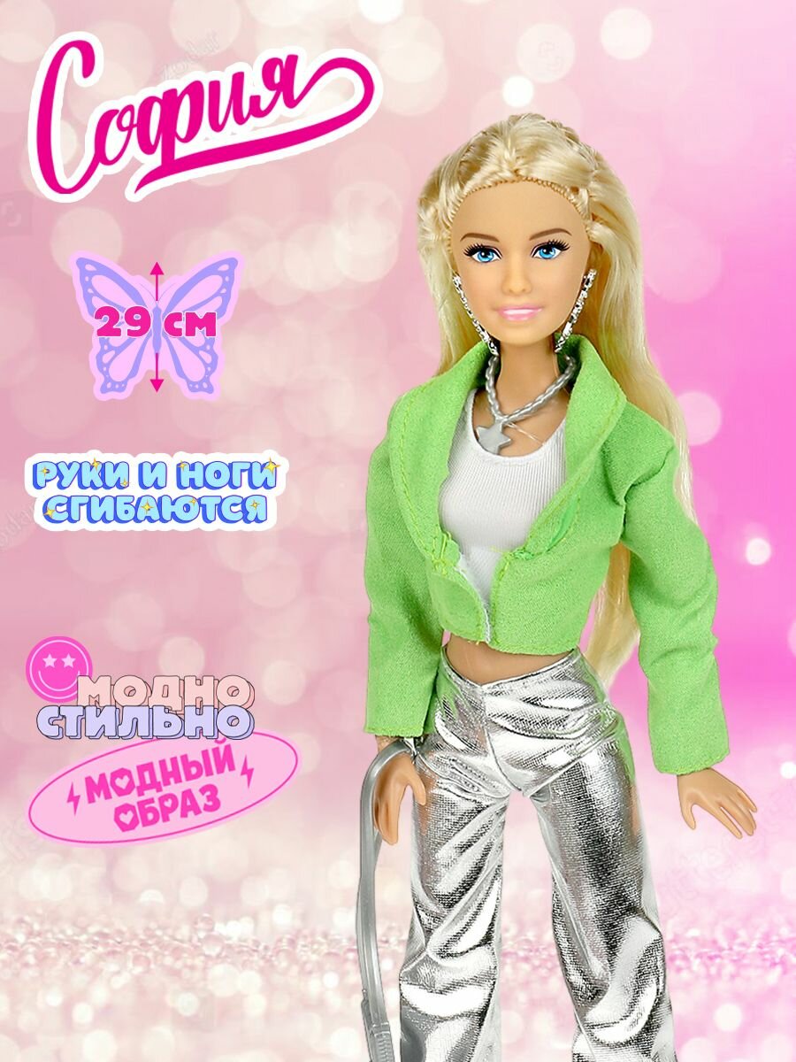 Модница-София одета в белую кофточку, серебристые брюки и зелёный укороченный пиджак. Образ куколки дополняют модные крупные серьги, колье и элегантная сумочка. Одежду и аксессуары легко снять и надеть. С такой модной куклой девочке будет интересно и весело играть: благодаря тому, что руки и ноги куклы подвижны, им можно придать любое положение. У Софии длинные красивые волосы, которые хозяйка куклы сможет заплетать в разные причёски. Детально проработанный дизайн игрушки вдохновит девочку на новые игровые сюжеты.