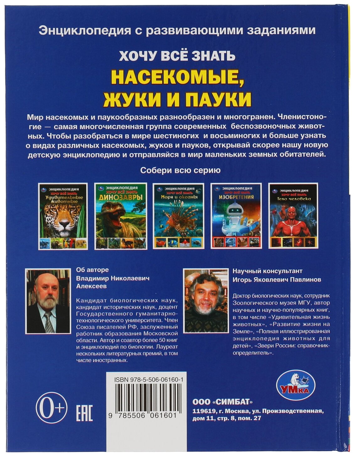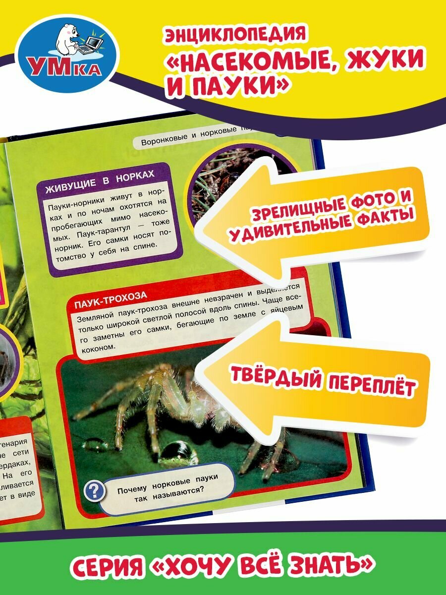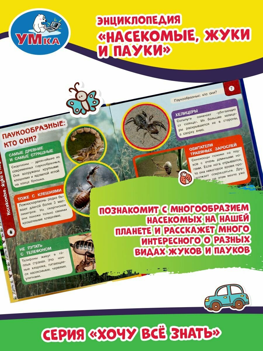 Энциклопедия с развивающими заданиями «Насекомые, жуки и пауки» из серии «Хочу всё знать» ТМ «УМка» станет отличным подарком для любознательных детей: