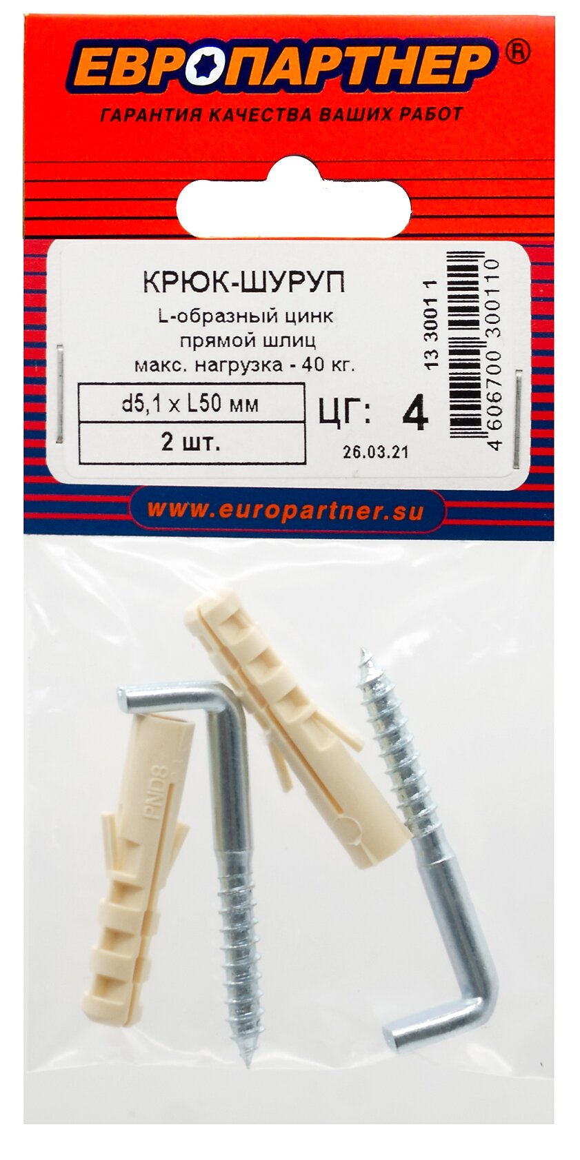 Сервис сравнения цен СкидкаГИД предлагает сравнить цены на товар «Крюк - шуруп L - образный Zn 50 х 50 прямой шлиц Европартнер d5,1хL50 мм, 2 шт.»