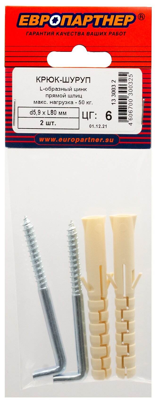 Крюк - шуруп L - образный Zn 60 х 80 прямой шлиц Европартнер