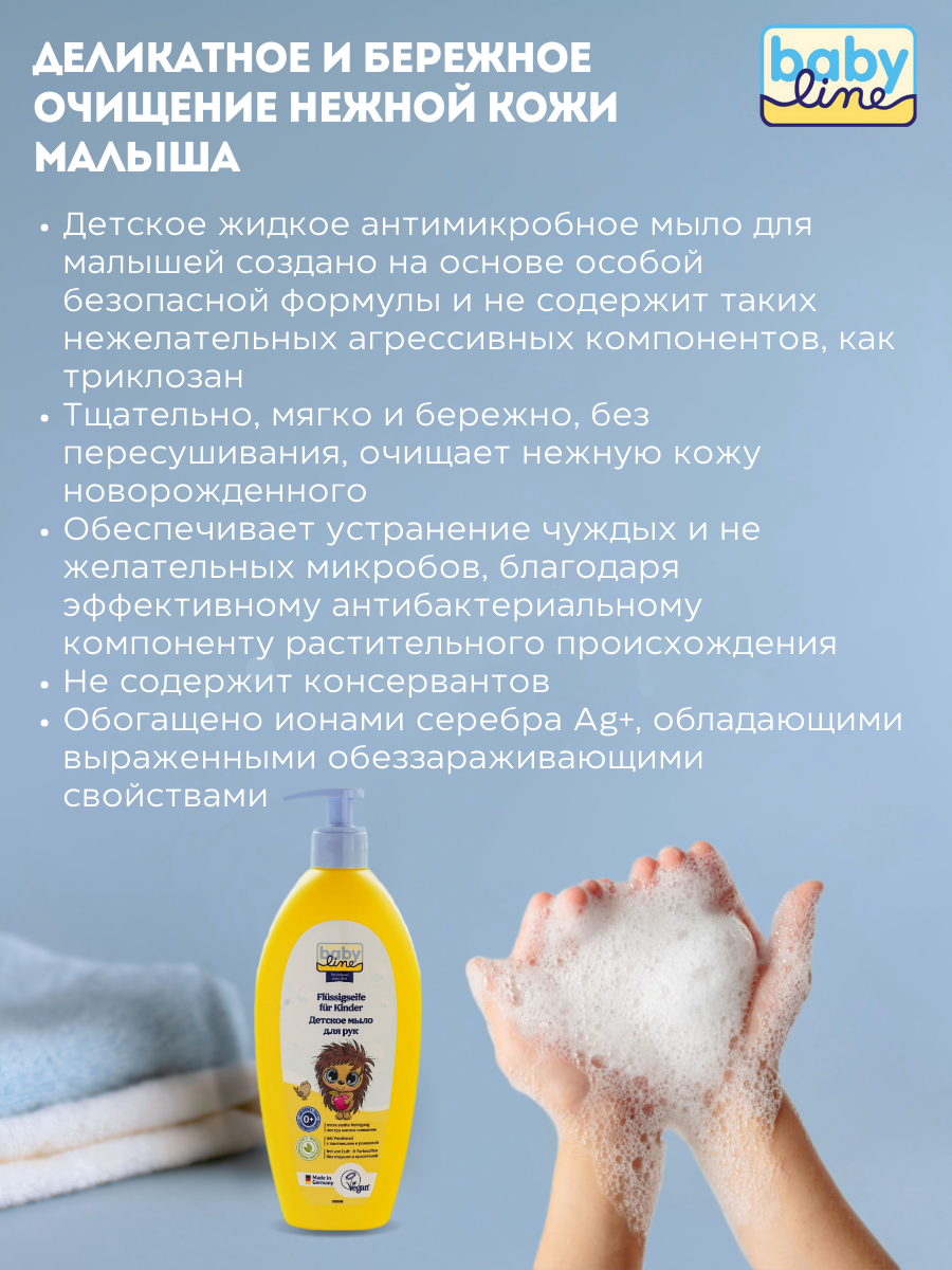 | Способ применения | Нанесите мыло на влажные руки или тело ребенка, вспеньте, затем хорошо смойте водой. |