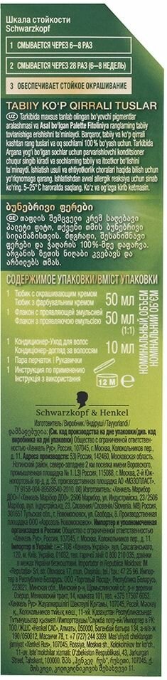 | Химический состав | Окрашивающий крем: Aqua (Water, Eau), Cetearyl Alcohol, Glyceryl Stearate SE, Ceteareth-20, Toluene-2,5-Diamine Sulfate, Octyldodecanol, Sodium Laureth Sulfate, Ethanolamine, Sodium Cetearyl Sulfate, Resorcinol, 2,4-Diaminophenoxyethanol HCl, 4-Chlororesorcinol, Sodium Sulfite, Oleic Acid, Parfum (Fragrance), Glycerin, Carbomer, m-Aminophenol, Etidronic Acid, Ascorbic Acid, Potassium Hydroxide, Serine, Sodium Sulfate, Propylene Glycol, Linalool, Hexyl Cinnamal, Benzyl Alcohol, Benzoic Acid, Theobroma Cacao (Cocoa) Seed Butter. Проявляющая эмульсия: Aqua,Hydrogen Peroxide, Cetearyl Alcohol, Propylene Glycol, Ceteareth-20, Steartrimonium Chloride, Paraffinum Liquidum, Etidronic Acid, 2,6-Dicarboxypyridine, Disodium Pyrophosphate, Potassium Hydroxide, Isopropyl Alcohol, Sodium Benzoate. Ухаживающий кондиционер для волос |