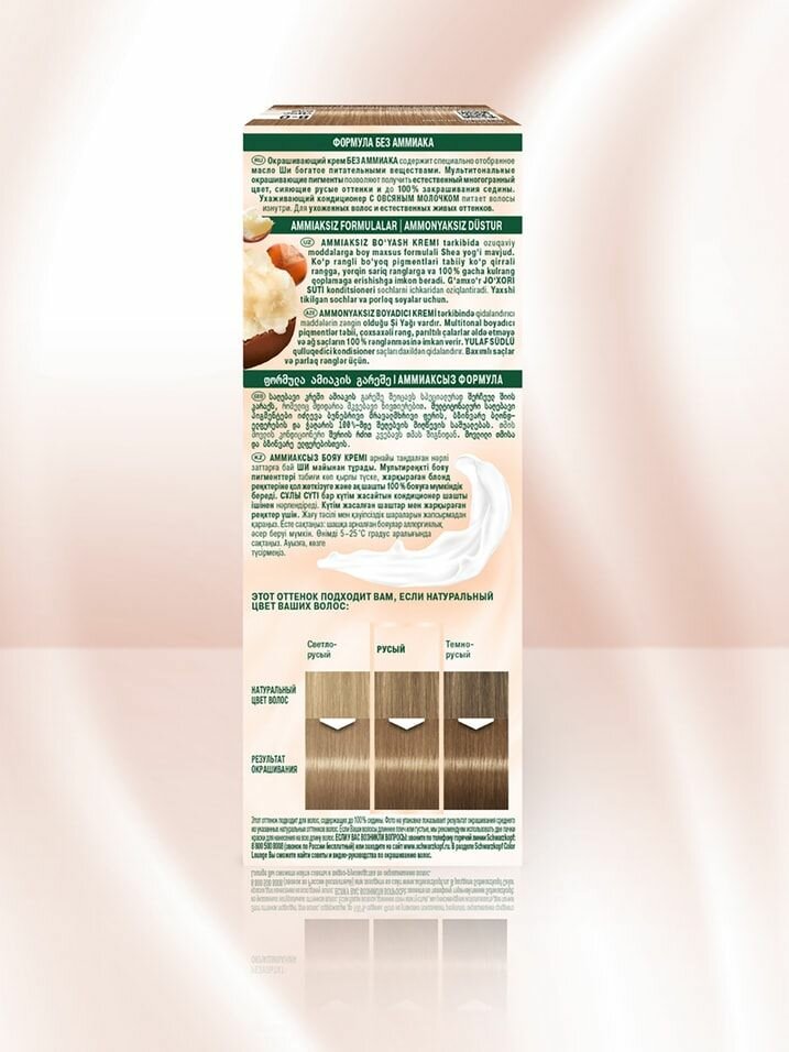 Окрашивающий крем без аммиака содержит специально подобранное масло Ши, богатое питательными веществами.