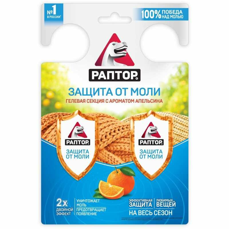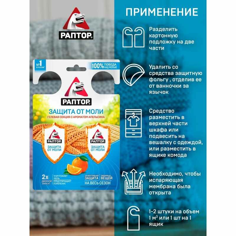 Защитите свои любимые вещи от моли! Сохранить уютные шерстяные свитера, элегантные кашемировые пальто, невесомые пуховики, роскошные шубы и шапки из натурального меха в их первозданном виде - непростая задача!Когда другие средства от моли не помогают, на выручку приходит гелевая секция РАПТОР! Видимый результат уже с первого дня применения!Благодаря эффективной формуле, разработанной для борьбы с молью и профилактики её появления, гелевая секция РАПТОР Двойной эффект с лёгкостью уничтожит не только моль, но и её личинки! Плюс подарит вам 4 месяца надёжной защиты от прожорливых насекомых!Разделите секцию на две части по линии перфорации и разложите в ящиках для хранения вещей или повесьте в шкафу или гардеробной комнате.Приятное дополнение - лёгкий аромат апельсина наполнит всё вокруг едва уловимым дыханием французского ПровансаВот увидите - ваши вещи будут вам благодарны и с удовольствием продолжат обнимать, согревать и украшать вас ещё не один сезон!Секрет популярности гелевой секции от моли РАПТОР Двойной эффект:- Эффективная формула для борьбы с молью и её личинками + профилактика появления новых особей- Содержит активное действующее вещество - трансфлутрин- Видимый эффект с первого дня использования- Удобная форма - можно положить в ящик или повесить в шкаф - Приятный аромат апельсина
