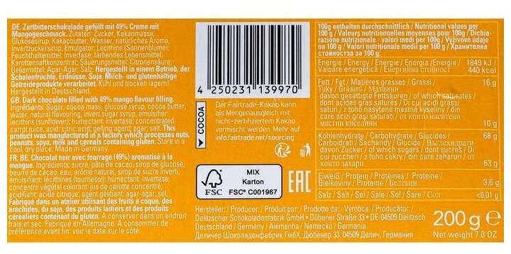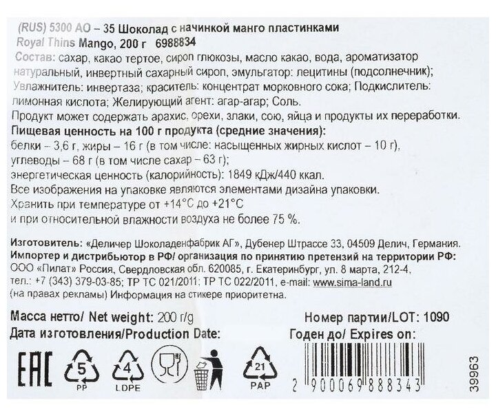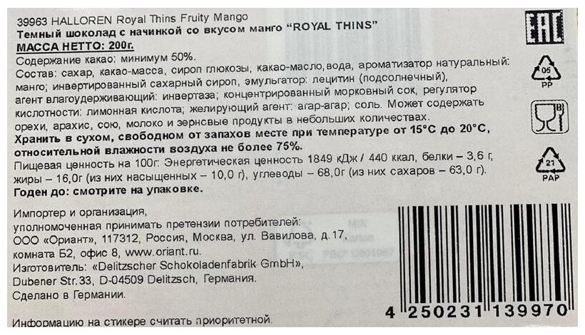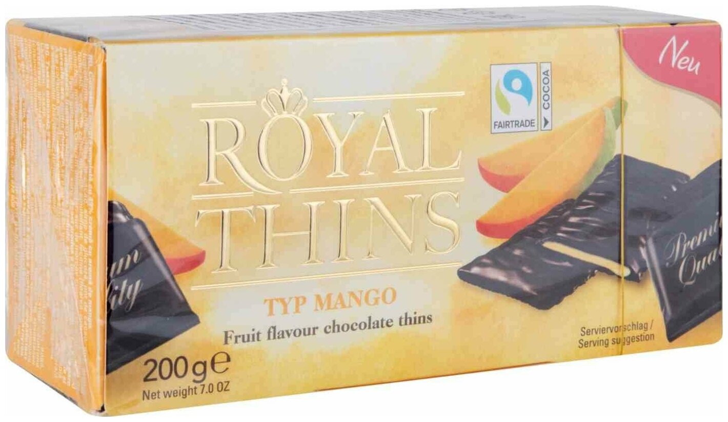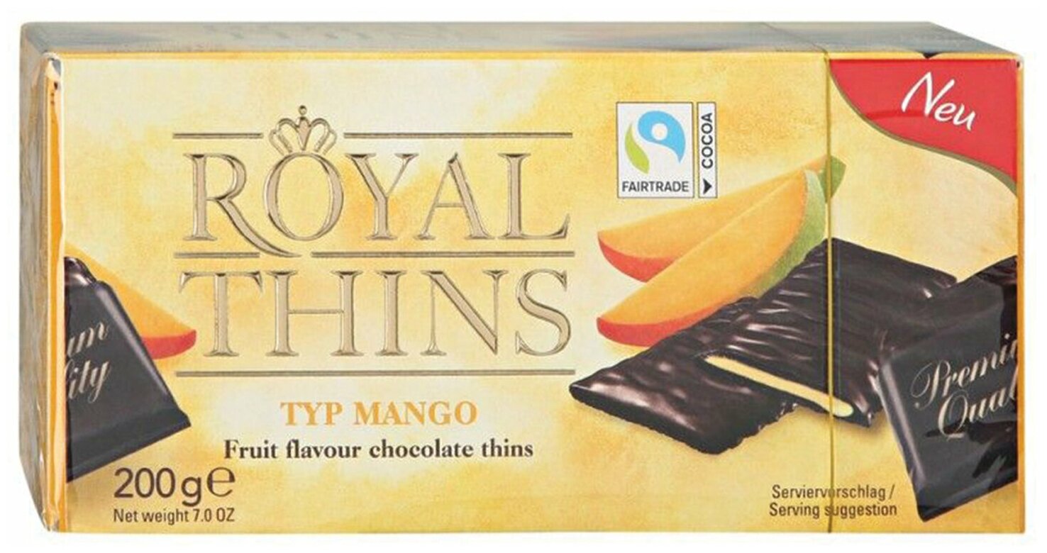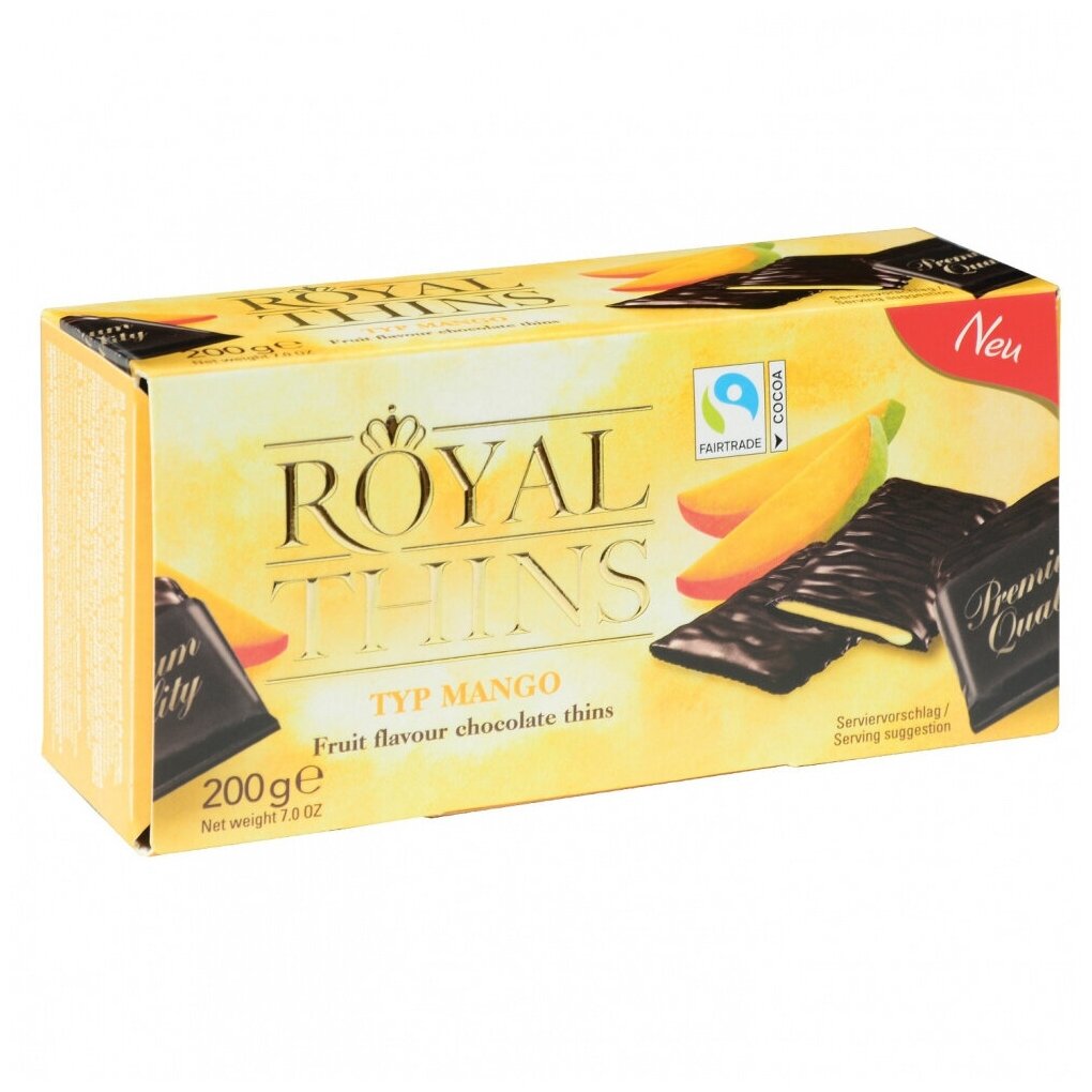 Шоколад со вкусом манго Royal Thins марки Halloren это изысканный десерт с оригинальным вкусом. В меру сладкий с мягкой тянущейся фруктовой начинкой он буквально тает во рту, оставляя приятное долгое послевкусие. Необычное сочетание сочного манго с темным шоколадом оценят даже искушенные гурманы. А благодаря индивидуальной упаковке каждой пластинки шоколад удобно есть, не испачкав рук