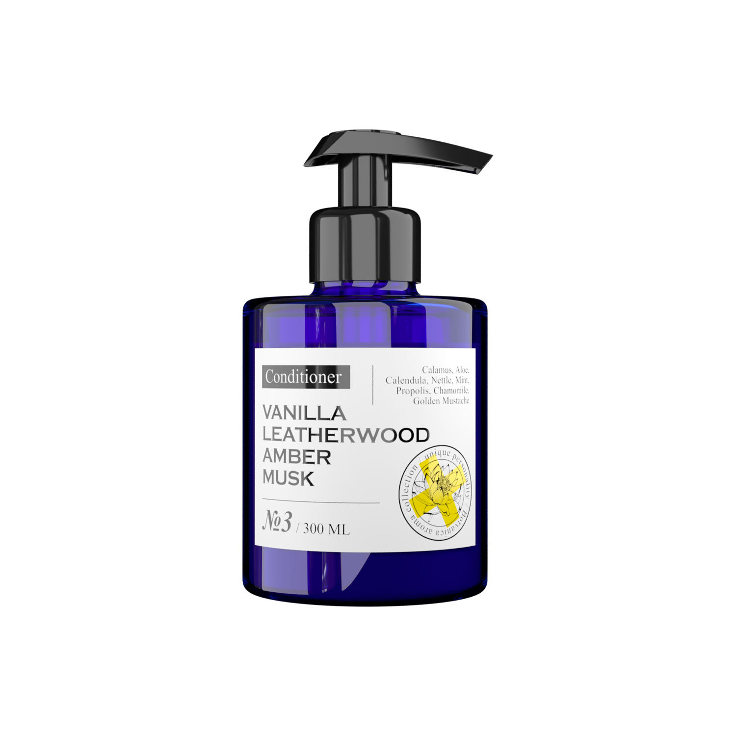 Питательный парфюмированный кондиционер для волос с нотами Ванили, Кожи, Амбры и Мускуса деликатно ухаживает за кожей головы и волосами.