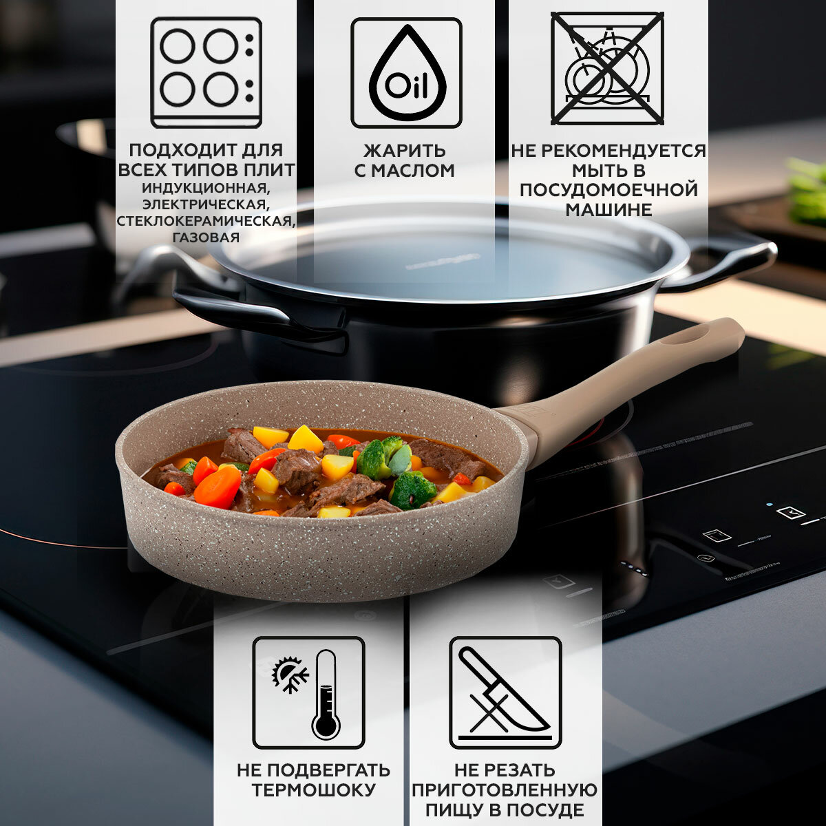 Сковорода диаметром 20 см и высотой стенок 4,5 см идеально подходит для приготовления завтрака (яичницы, омлета), ее быстро и удобно мыть.