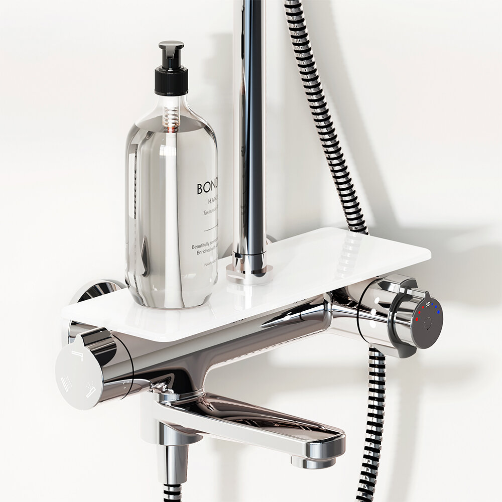 Стильный и лаконичный дизайн душевой системы Jupiter прекрасно подойдет как для классической так и для современной ванной комнаты. Максимальная безопасность: термостатический картридж 35 мм обеспечивает точную настройку температуры и напора воды. Благодаря телескопической штанге с диапазоном регулировки 400 мм ежедневные процедуры будут одинаково комфортны для людей любого роста. Большое количество форсунок с микроотверстиями которые распределяют поток мягкими равномерными струями обеспечит вам расслабляющий эффект настоящего домашнего SPA. Переключайте потоки воды между ручной и тропической лейками плавным поворотом дивертора. Угол наклона тропической лейки можно регулировать. Инновационное покрытие High Gloss надежно защищает хромовую поверхность душевой системы от мелких повреждений и сохраняет ювелирный блеск на долгие годы.