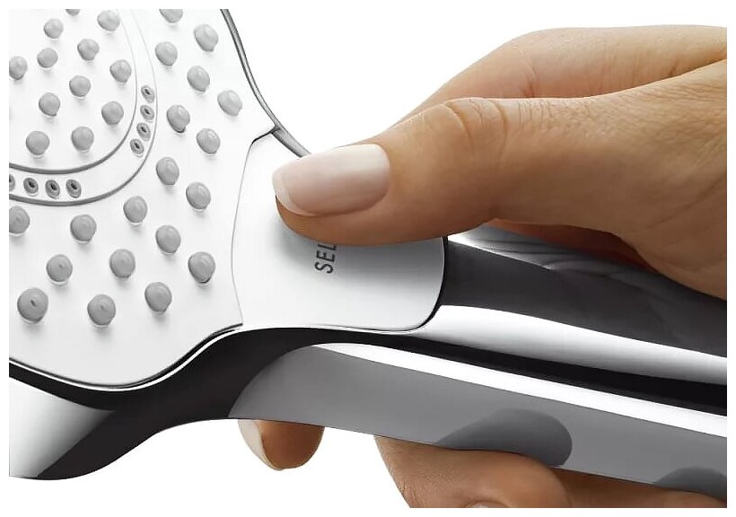 Гарнитур для душа Croma Select E Multi Hansgrohe отличается продуманной конструкцией и эргономичным дизайном. Ручной душ имеет увеличенный диаметр - 110 мм. В зависимости от настроения вы можете выбрать мягкую струю SoftRain, интенсивную IntenseRain или мощную массажную. Для переключения режима работы достаточно нажать на кнопку Select, расположенную на душевой лейке.