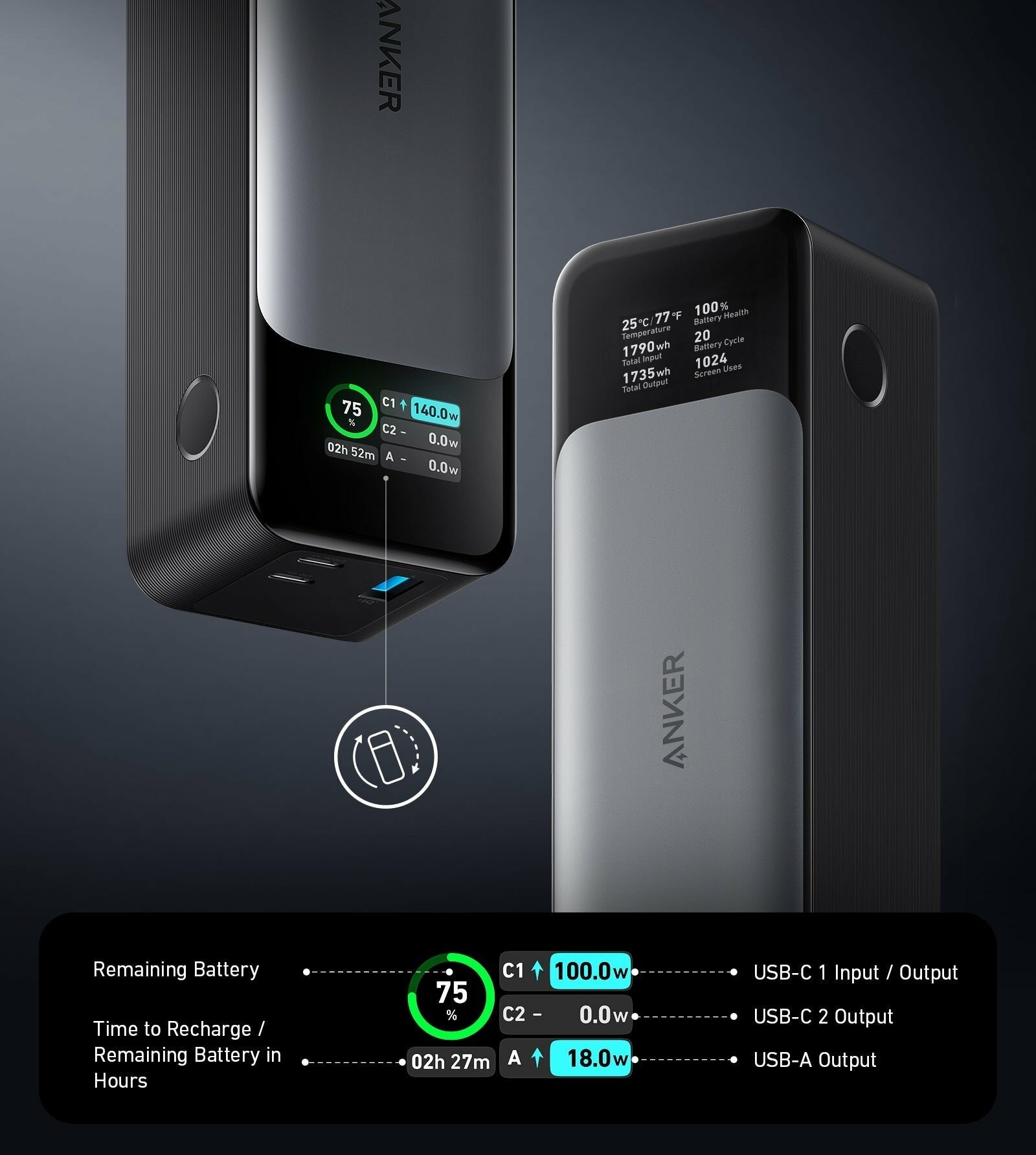 Anker 737 GaN Prime представляет собой внешний аккумулятор для портативной техники с большой ёмкостью. Технология быстрой зарядки. Аккумулятор оснащён технологией Power Delivery 3.1 и двунаправленной технологией, которая гарантирует сверхмощную зарядку 140 Вт. Большая ёмкость. Благодаря ёмкости 24 000 мАч и удвоенному времени автономной работы вы можете до 5 раз заряжать iPhone 13, а iPad Pro 12.9 дюйма 2021 года - 1.3 раза. Умный цифровой дисплей. Легко читаемый цифровой дисплей показывает выходную и входную мощность, а также расчётное время полной зарядки портативного зарядного устройства. Возможность зарядки 3 устройств. Устройство имеет три выхода и позволяет одновременно заряжать до трёх разных устройств. Система безопасности ActiveShield 2.0. В данной модели используется система безопасности ActiveShield для усиленной защиты. Она включает в себя датчик динамической температуры, который активно контролирует температуру, и Power Tuner, который регулирует выходную мощность для защиты подключённого устройства. Компактность. Anker 737 GaN Prime очень удобен и компактен. Вы можете легко носить его с собой в сумочке или рюкзаке.