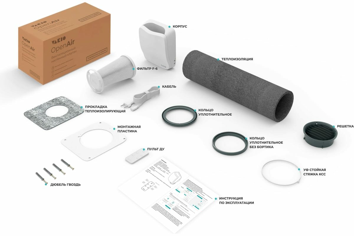 | Комплект поставки | Корпус 1 шт., Фильтр 1 шт., Монтажная пластина 1 шт., Прокладка теплоизолирующая 1 шт., Комплект крепежа (Дюбель гвозди) 1, Кабель питания 220В длина 2.5м - 1 шт., Пульт ДУ 1 шт., Кольцо уплотнительное без бортика 1 шт., Кольцо уплотнительное с бортиком 1 шт., Решетка наружняя 1 шт., УФ стойкая стяжка КСС 1 шт., Руководство по эксплуатации 1 шт. |