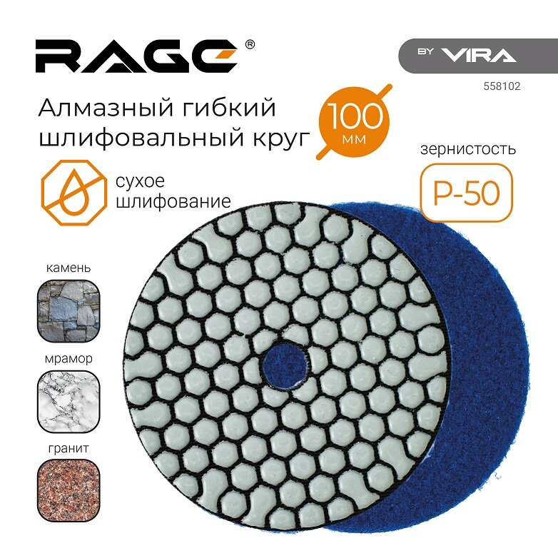 **Шлифовальный круг алмазный гибкий P50 (АГШК) Rage** разработан специально для сухого типа шлифования, черновой обработки бетонных конструкций, камня, изделий из мрамора и гранита