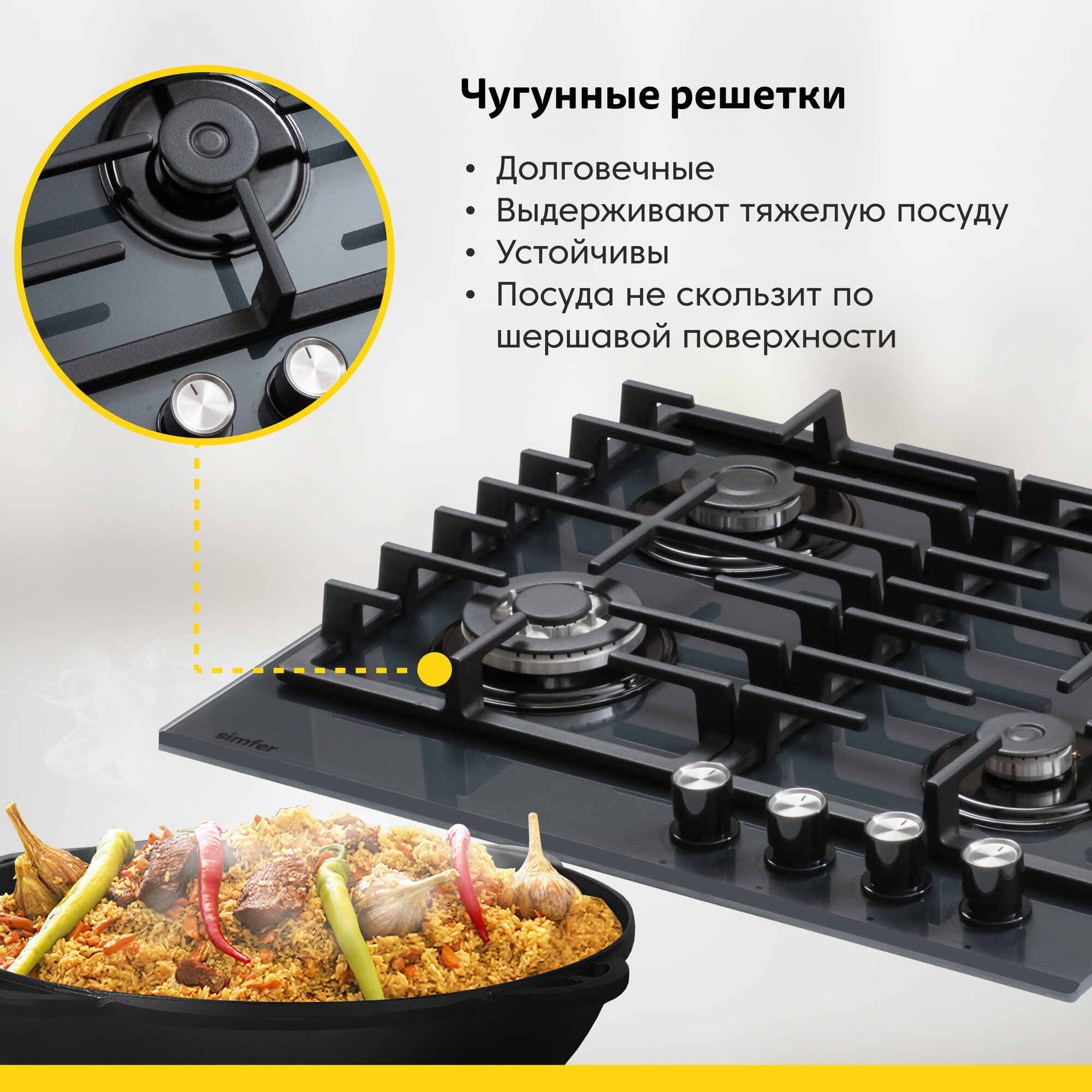 Сервис сравнения цен СкидкаГИД предлагает сравнить цены на товар «Газовая варочная поверхность Simfer H60H41G570 (газ-контроль WOK конфорка чугунные решетки серое стекло)»