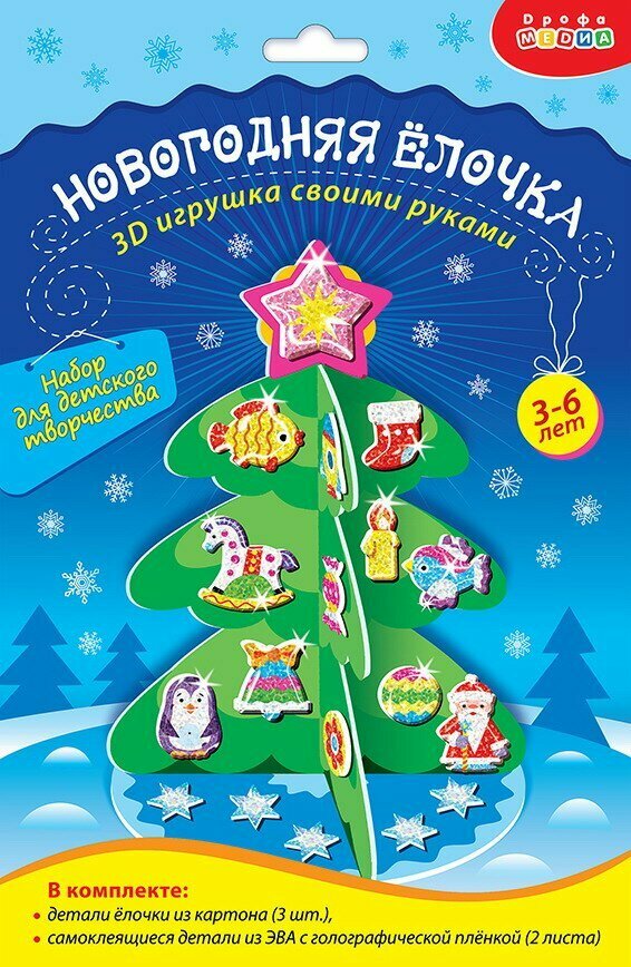 В комплекте: детали ёлочки из картона (3 шт.), самоклеящиеся детали из ЭВА с голографической пленкой (2 листа).