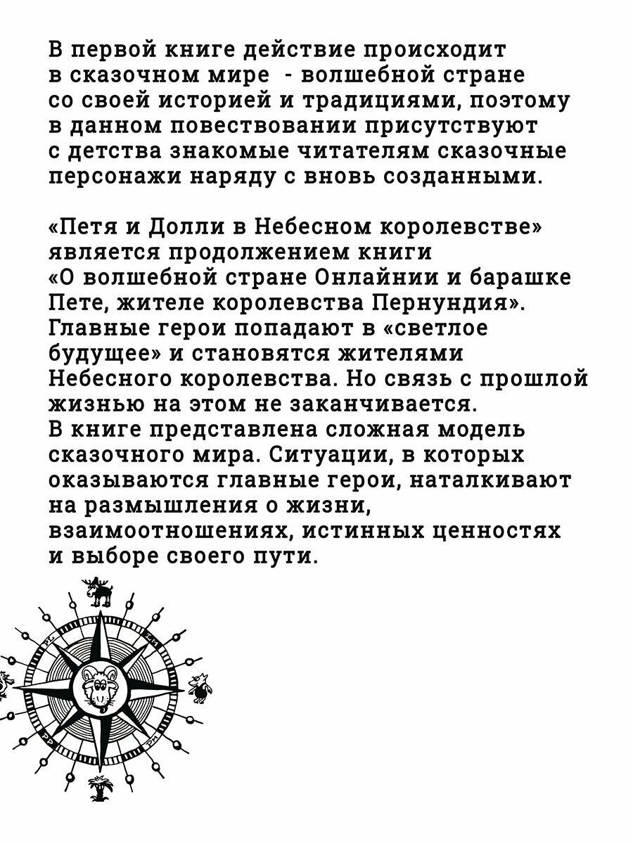 "Петя и Долли в Небесном королевстве" является продолжением книги О волшебной стране Онлайнии и барашке Пете, жителе королевства Пернундия". Главные герои попадают в "светлое будущее" и становятся жителями Небесного королевства. Но связь с прошлой жизнью на этом не заканчивается.