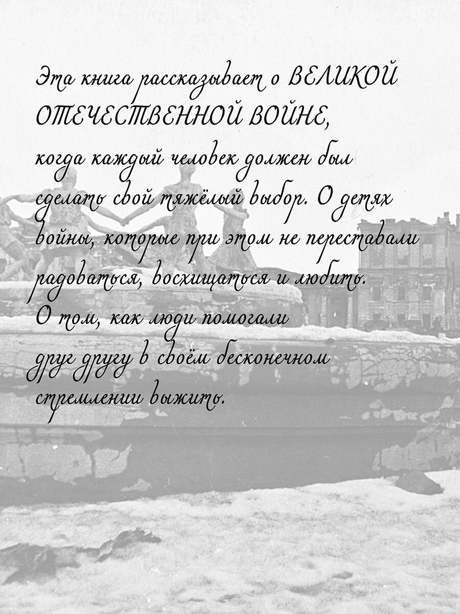 Эта книга рассказывает о Великой Отечественной войне, когда каждый человек должен был сделать свой тяжёлый выбор. О детях войны, которые при этом не переставали радоваться, восхищаться и любить. О том, как люди помогали друг другу в своём бесконечном стремлении выжить.