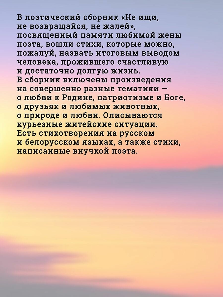 В поэтический сборник "Не ищи, не возвращайся, не жалей", посвященный памяти любимой жены поэта, вошли стихи, которые можно, пожалуй, назвать итоговым выводом человека, прожившего счастливую и достаточно долгую жизнь. В сборник включены произведения на совершенно разные тематики - о любви к Родине, патриотизме и Боге, о друзьях и любимых животных, о природе и любви. Описываются курьезные житейские ситуации. Есть стихотворения на русском и белорусском языках, а также стихи, написанные внучкой поэта.