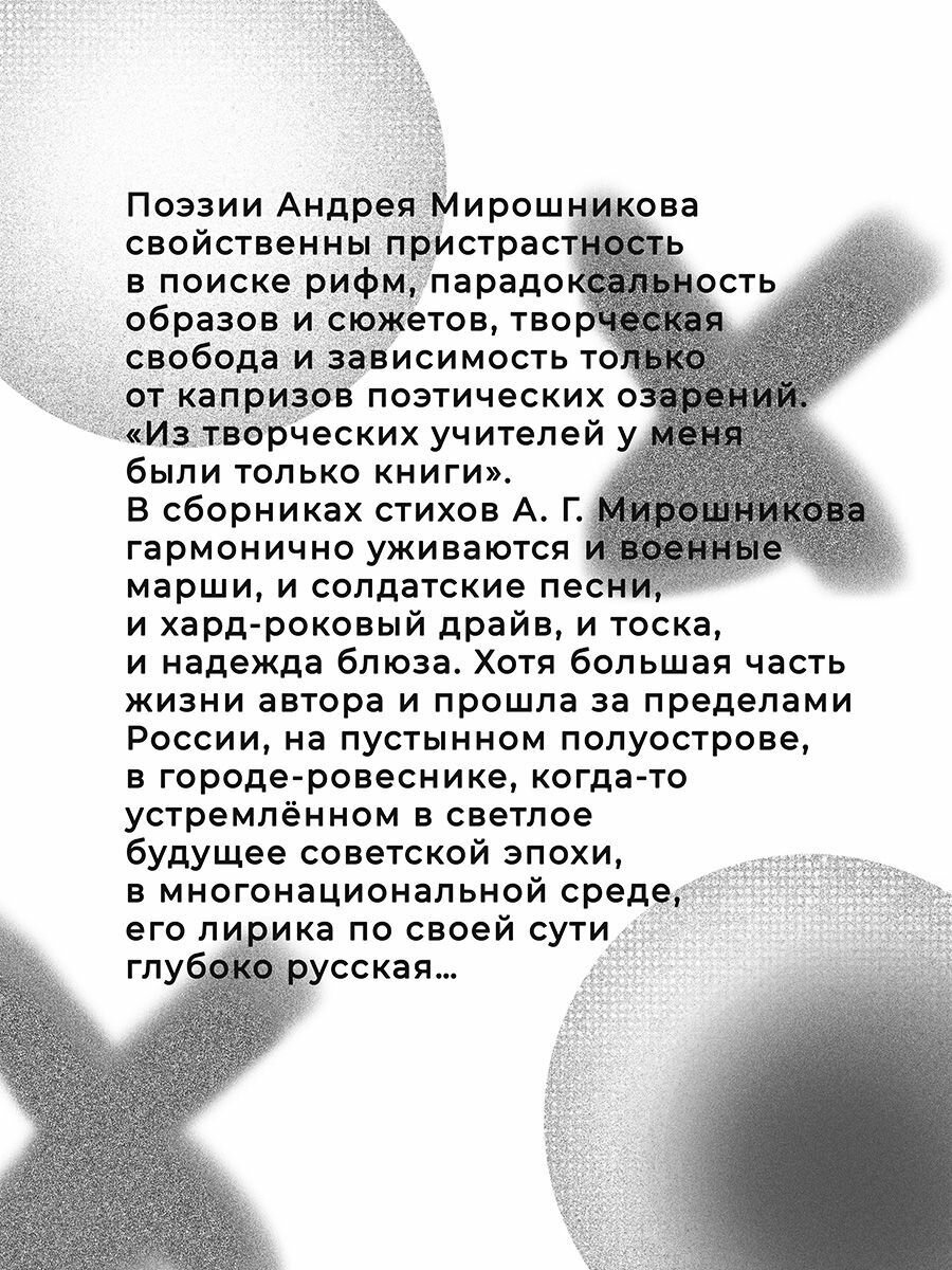 В сборниках стихов А.Г.Мирошникова гармонично уживаются и военные марши, и солдатские песни, и хард-роковый драйв, и тоска, и надежда блюза. Хотя большая часть жизни автора и прошла за пределами России, на пустынном полуострове, в городе-ровеснике, когда-то устремлённом в светлое будущее советской эпохи, в многонациональной среде, его лирика по своей сути глубоко русская…