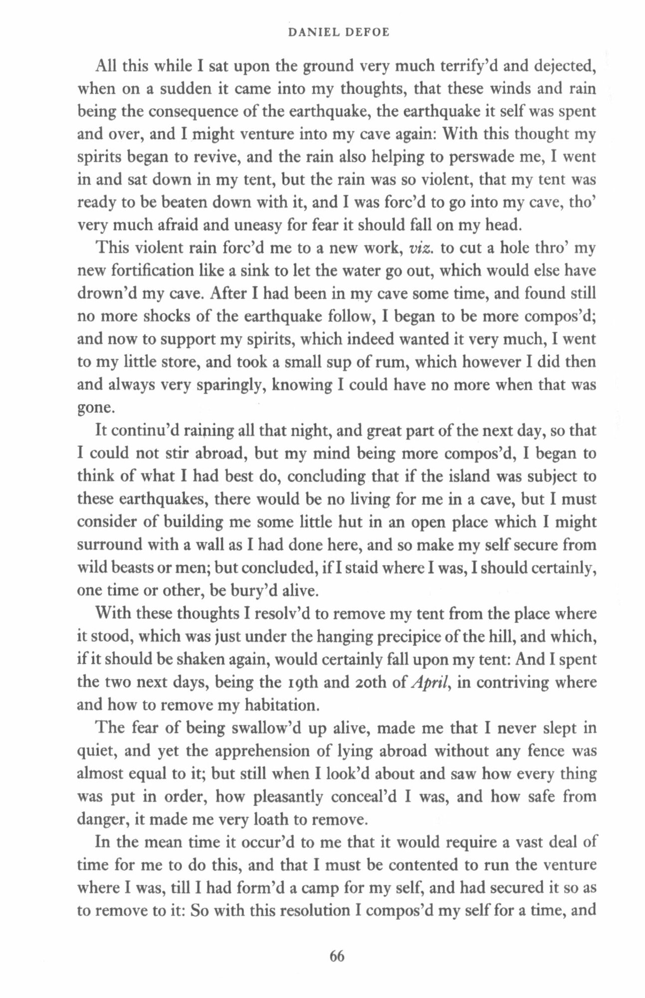 The sole survivor of a shipwreck, Robinson Crusoe is washed up on a desert island. In his journal he chronicles his daily battle to stay alive, as he conquers isolation, fashions shelter and clothes, enlists the help of a native islander who he names 'Friday', and fights off cannibals and mutineers. Written in an age of exploration and enterprise, it has been variously interpreted as an embodiment of British imperialist values, as a portrayal of 'natural man', or as a moral fable. But above all is a brilliant narrative, depicting Crusoe's transformation from terrified survivor to self-sufficient master of an island.