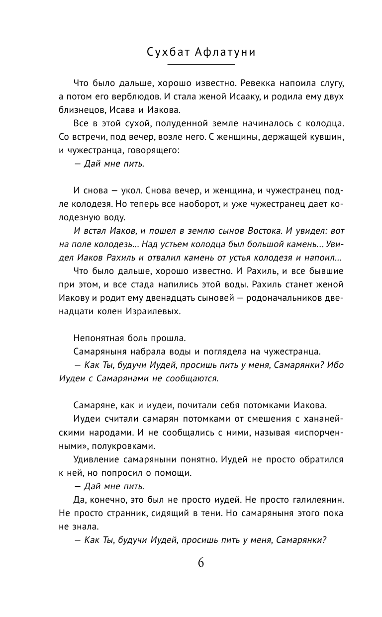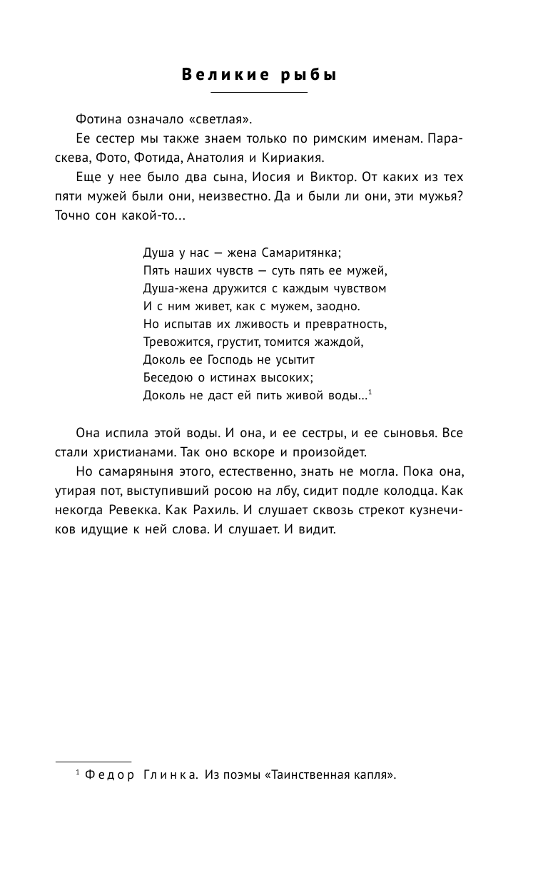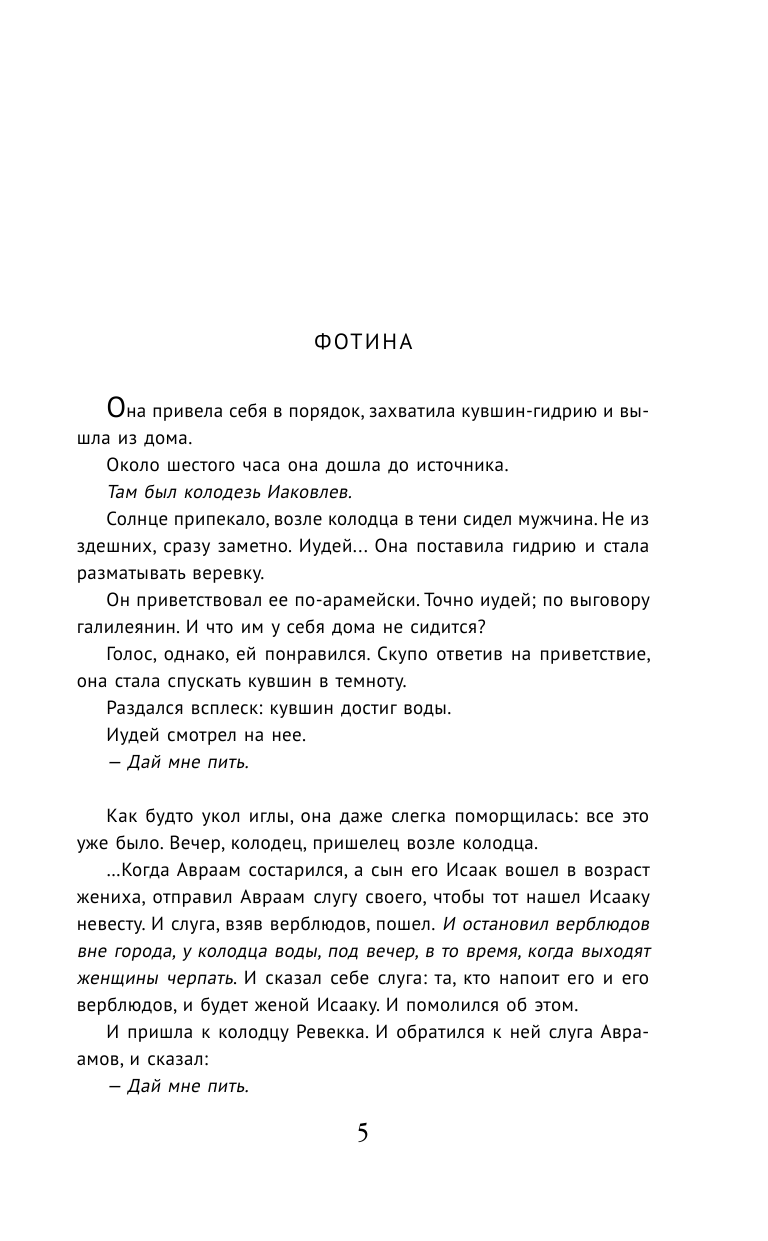 Иисус же сказал ей в ответ: если бы ты знала дар Божий и Кто говорит тебе: «дай Мне пить», ты сама просила бы у Него, и Он дал бы тебе воду живую. Она вытянула кувшин из колодца и поставила на плоский ка- мень. Отерла лоб. Еще раз оглядела путника. — Господин! Тебе и почерпнуть нечем, а колодезь глубок; откуда же у Тебя вода живая?