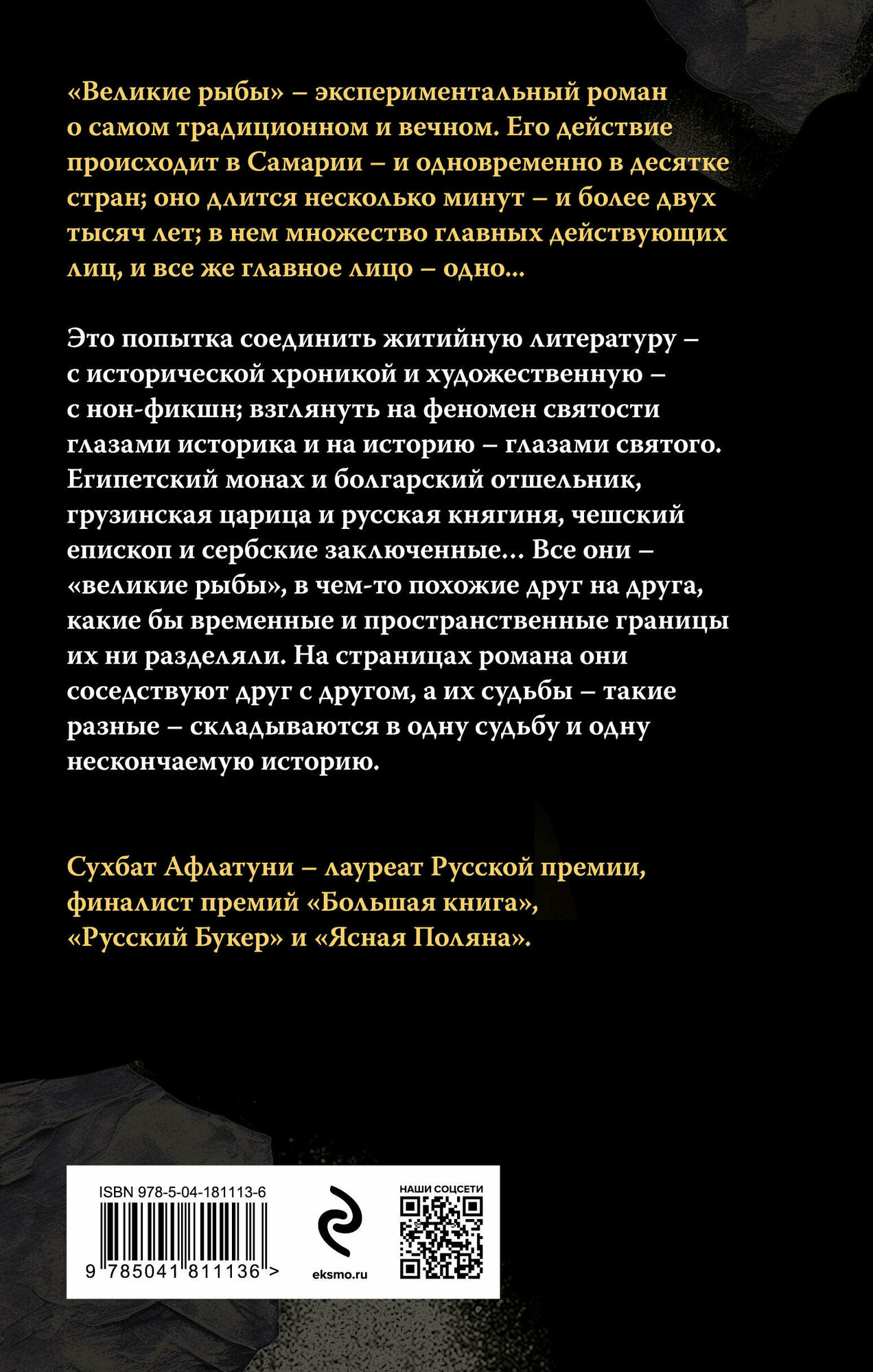 "Великие рыбы" – экспериментальный роман о самом традиционном и вечном. Его действие происходит в Самарии – и одновременно в десятке стран; оно длится несколько минут – и более двух тысяч лет; в нем множество главных действующих лиц, и все же главное лицо – одно Это попытка соединить житийную литературу – с исторической хроникой и художественную – с нон-фикшном; взглянуть на феномен святости – глазами историка и на историю – глазами святого.