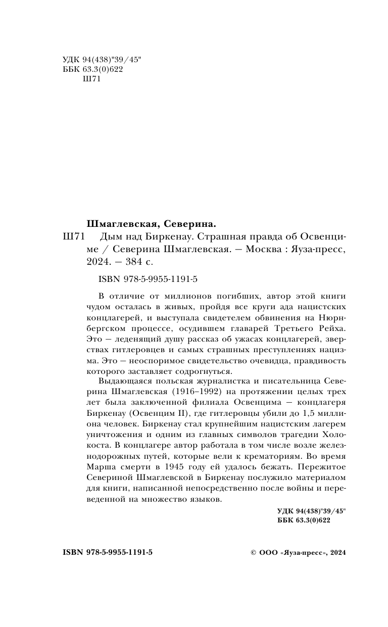 Дым над Биркенау. Страшная правда об Освенциме (Северина Шмаглевская); Яуза, 1945