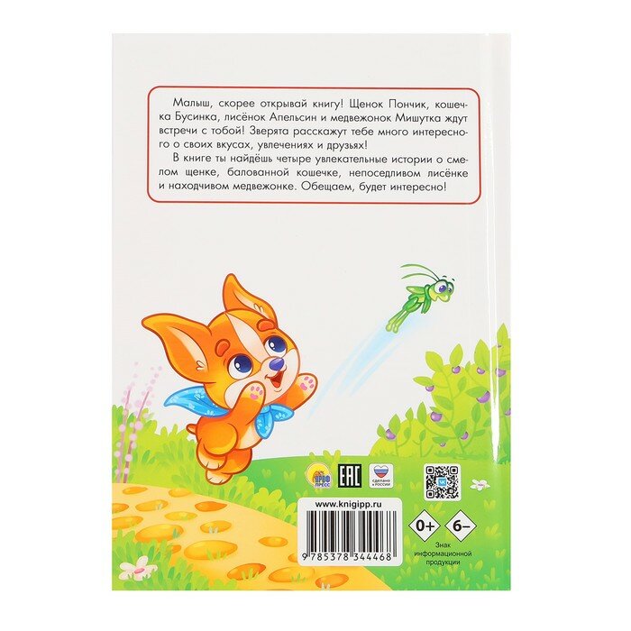 Малыш, скорее открывай книгу! Щенок Пончик, кошечка Бусинка, лисенок Апельсин и медвежонок Мишутка ждут встречи с тобой! Зверята расскажут тебе много интересного о своих вкусах, увлечениях и друзьях!